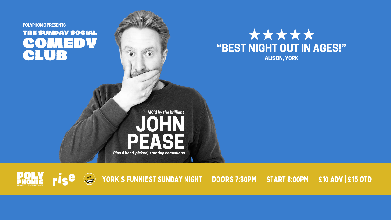 Join us at Rise, Bluebird Bakery, Acomb, for another unforgettable night of comedy.