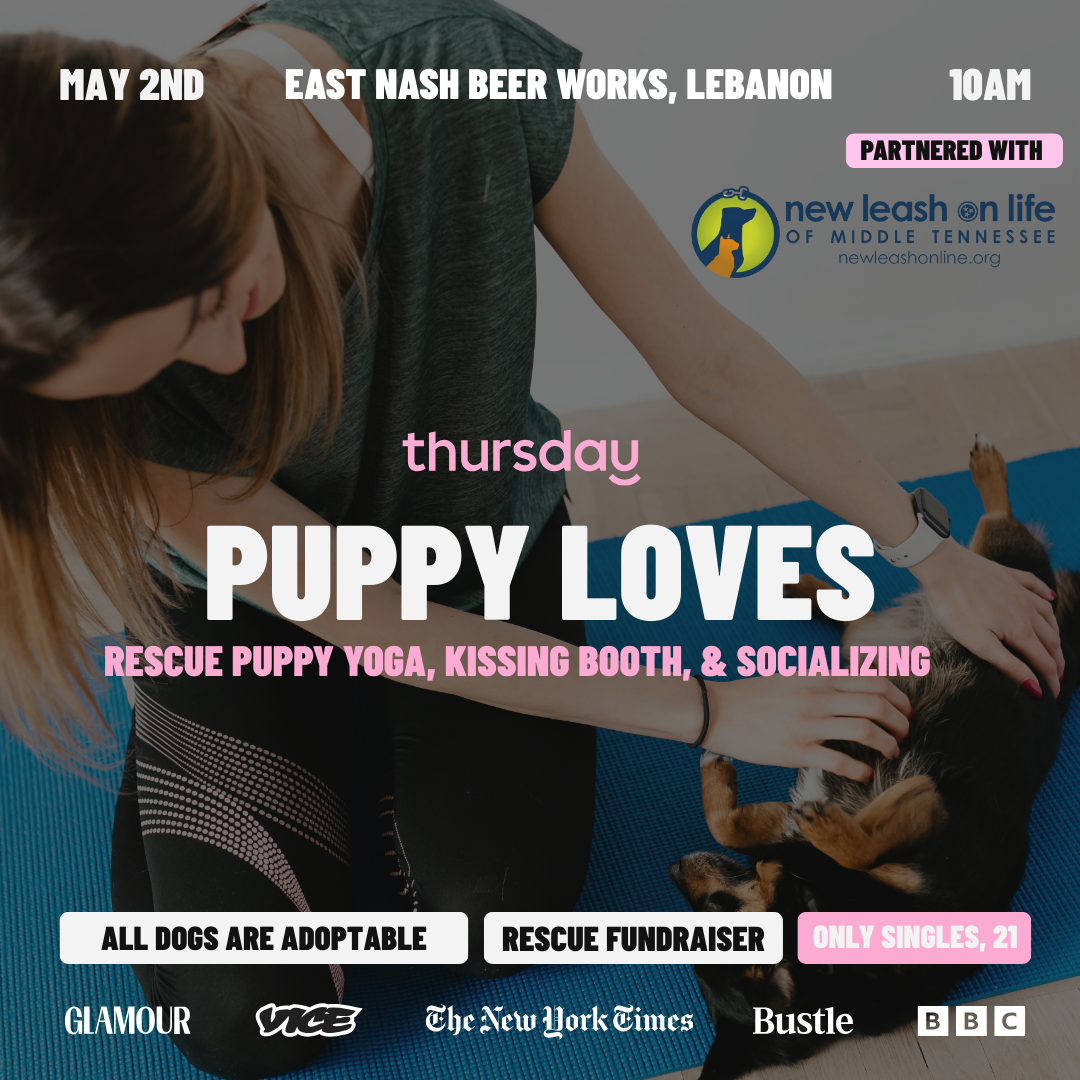 On Saturday, May 2nd, we’re teaming up with local favorites for a Rescue Puppy Yoga Fundraiser benefiting New Leash on Life, hosted at East Nashville Beer Works (Lebanon, TN). From 10–11am, enjoy an exclusive yoga class with plenty of adorable, adoptable puppies there to support you through every pose (and distraction) 🐶 A portion of every scanned ticket will be donated to New Leash on Life 🐕