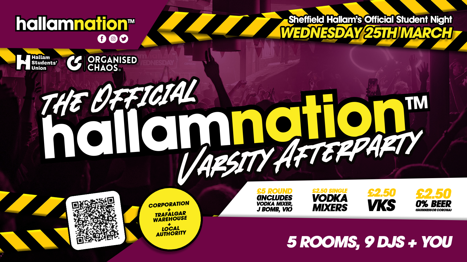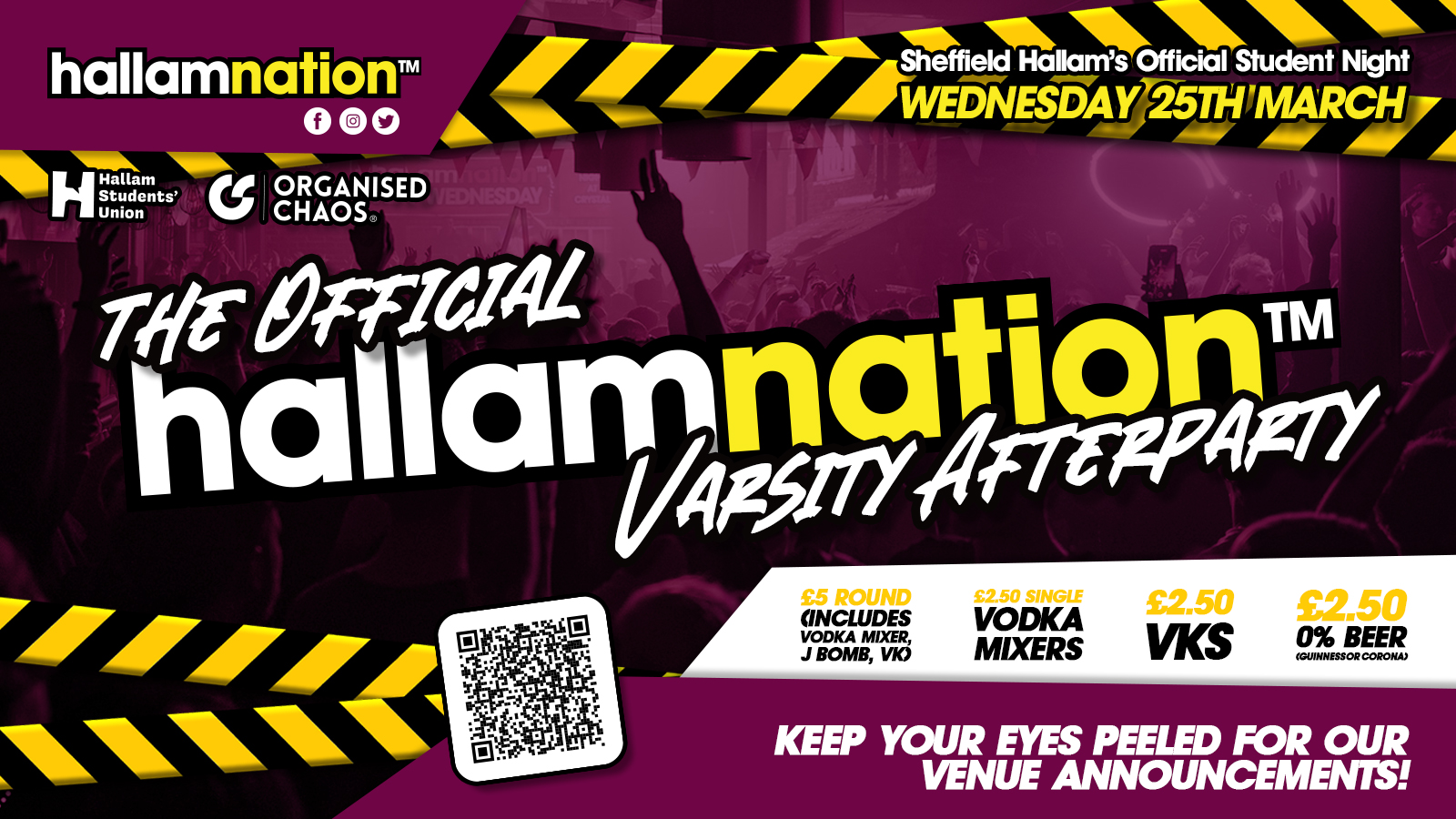 The biggest night of the HallamNation calendar is here! When the final buzzer goes the teams descend on HallamNation for multi room madness. Last semester saw queues around the block. Tickets for this one are a non-negotiable, grab them before we sell out in advance.