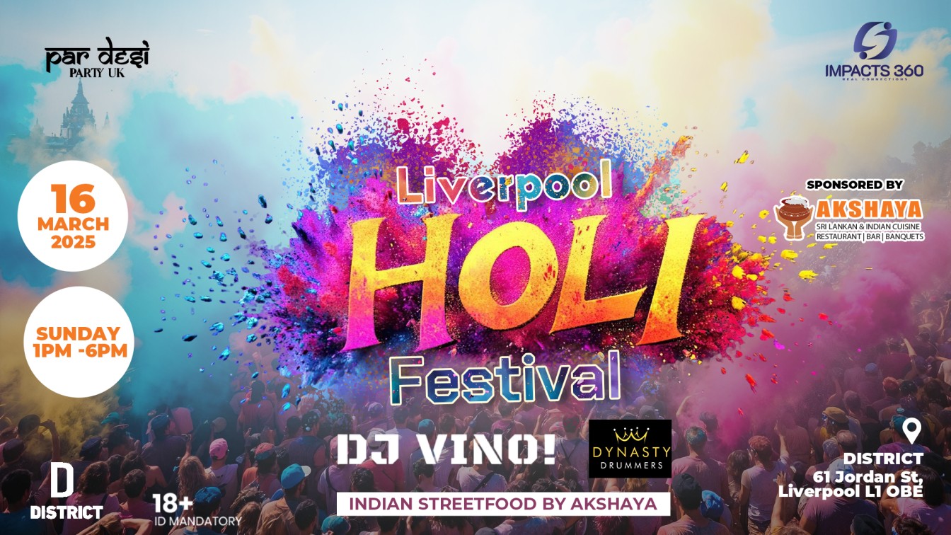 Tag your friends, wear white, and let’s make this Holi festival unforgettable! 🎊✨ #ColorBlast2025 #LiverpoolHoliFestival #BollywoodBeats #SouthIndianGrooves #DesiVibes