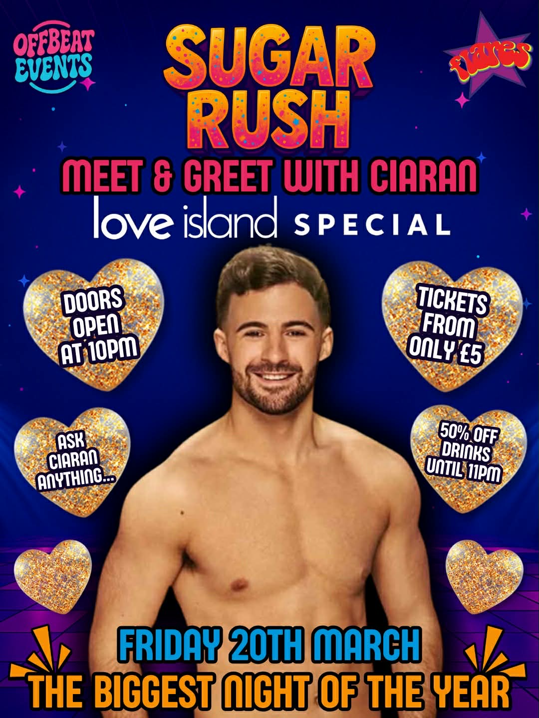 On Friday 20th March , we’re taking over Flares York with a special celebrity guest appearance from Ciaran, fresh from the current Love Island: All Stars series. Expect big energy, bigger vibes, and a night that’s guaranteed to be anything but sweet and simple.