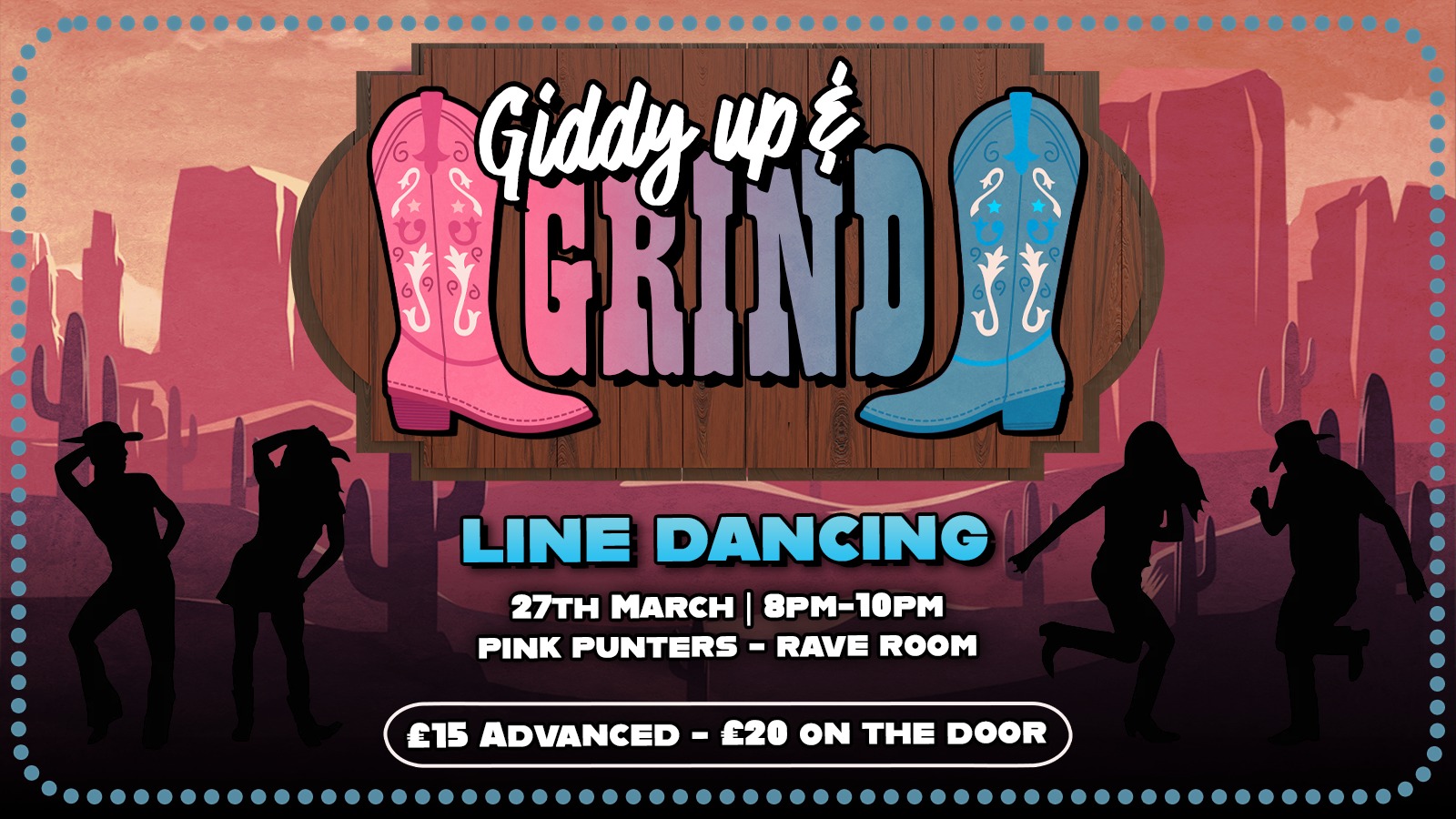 A fun night of Great Music, Line Dance Choreography Pure Pop, High Energy tracks teaching 2 x 40 minute Sets to get you dance routine ready for your night... Tickets £20 includes Free Entry into Pink Punters Nightclub to carry on your night.