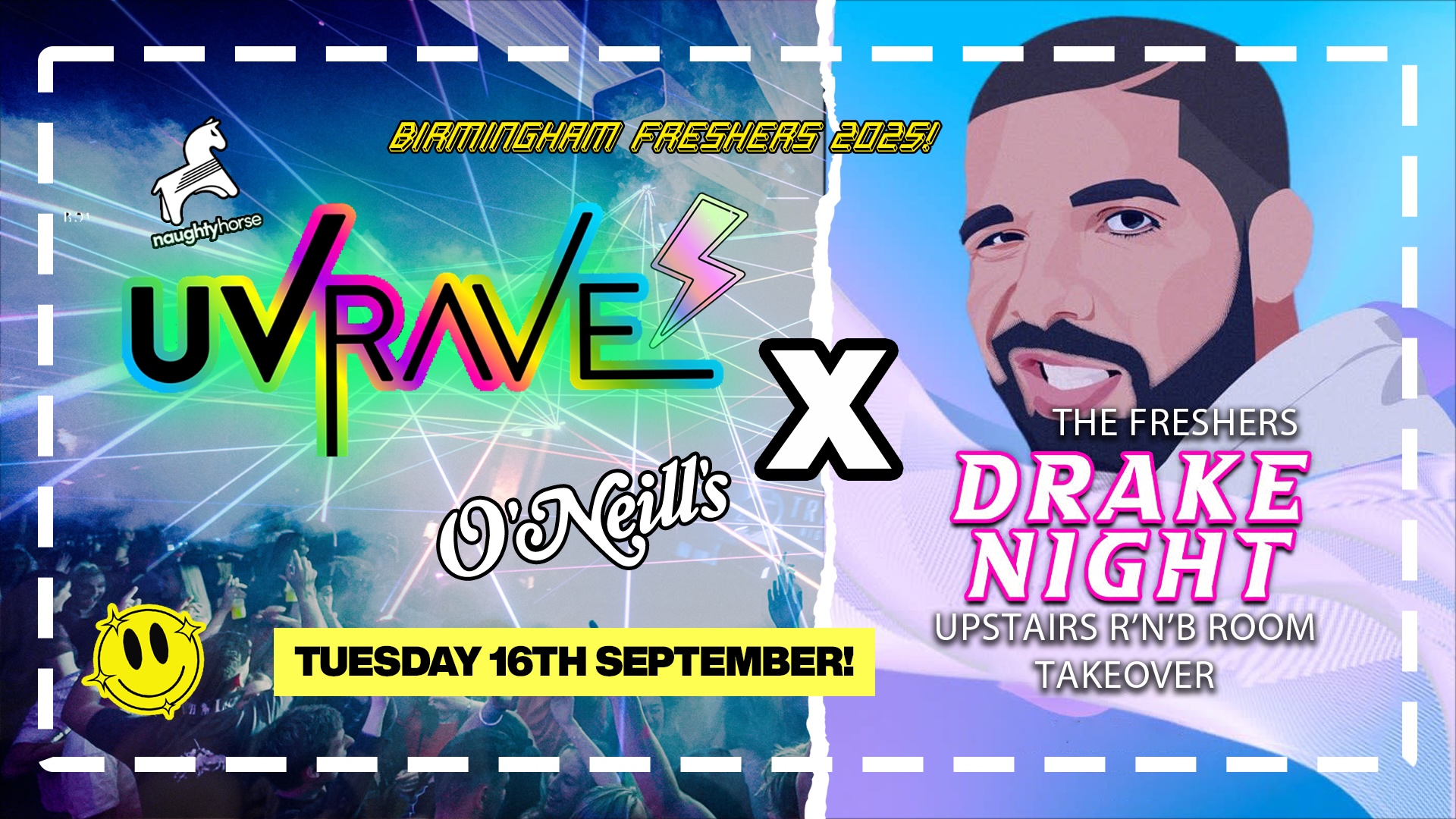 The annual Naughty Horse Freshers UV Rave X Drake night (Broad Street Takeover) is always the biggest night of the week!