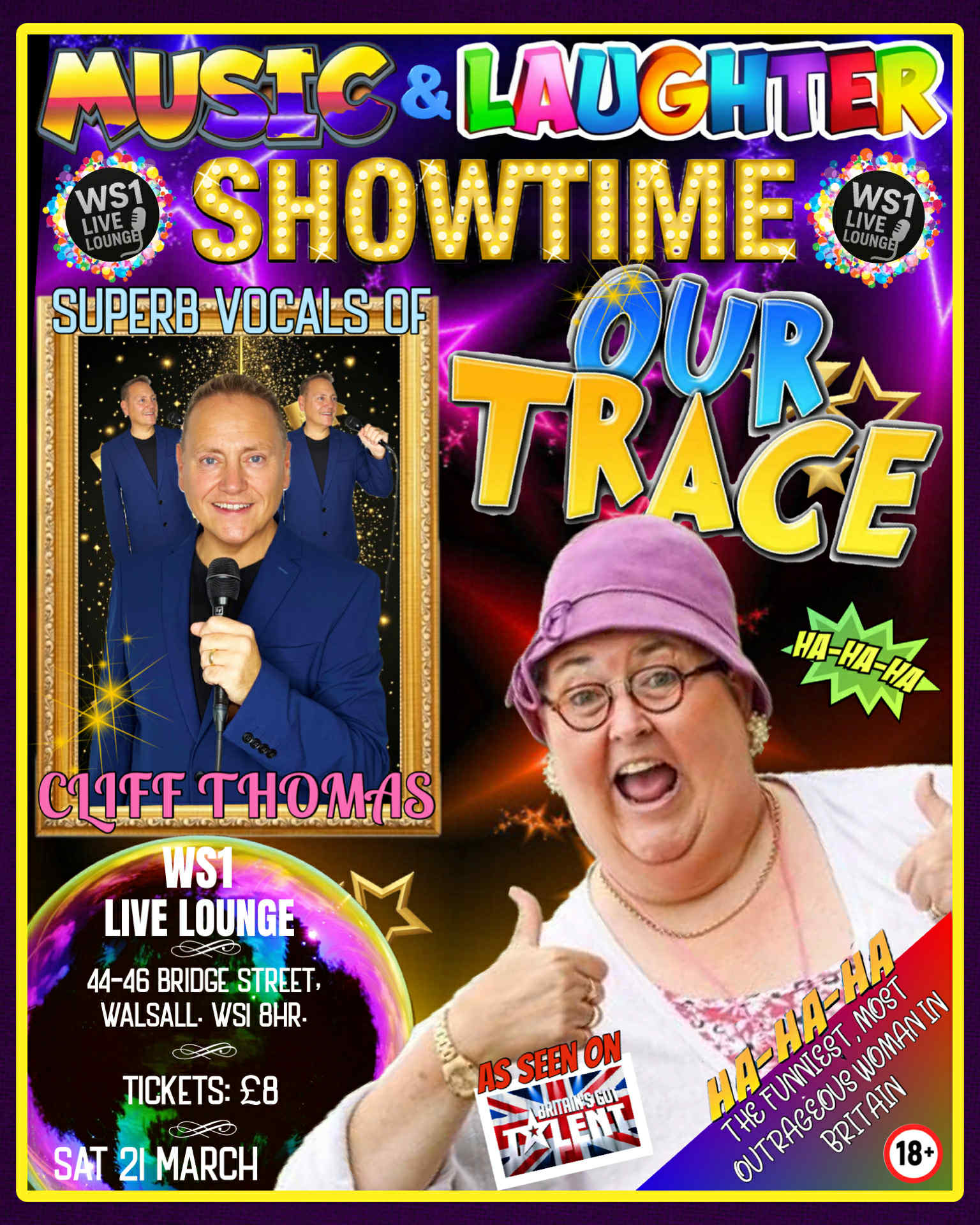 Come along to our night of music and adult comedy with multi award winning comic " Our Trace" and special guest vocalist Cliff Thomas