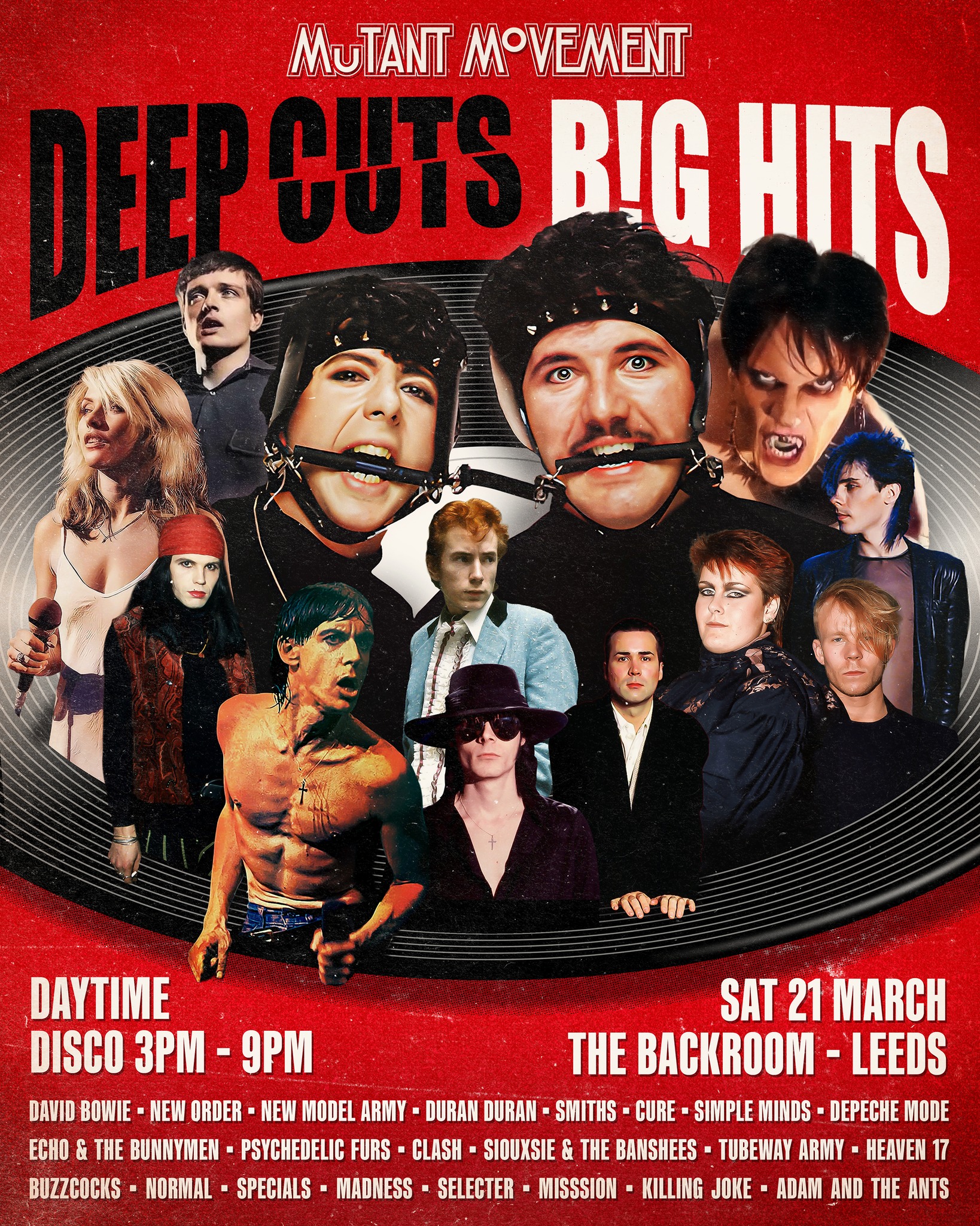 Expect to hear Soft Cell, Blondie, Yazoo, Iggy Pop, Human League, Sisters Of Mercy, Joy Division, Sex Pistols, Cramps, Cult, Bauhaus, David Bowie, New Order, New Model Army, Duran Duran, Smiths, Cure, Simple Minds, Depeche Mode, Echo & The Bunnymen, Psychedelic Furs, Clash, Siouxsie & The Banshees, Tubeway Army, Heaven 17, Buzzcocks, Normal, Specials, Madness, Selecter, Slits, Killing Joke, Mission, Adam And The Ants and more!
