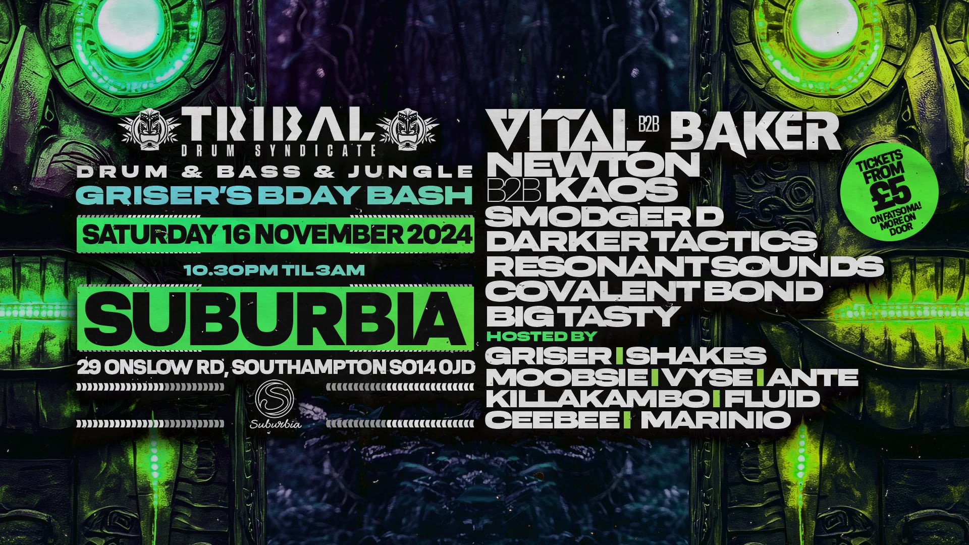 Two insanely weighty B2B's in the shape of VITAL B2B BAKER, and NEWTON B2B KAOS. These boys have all proved time and again that their wizardry on the decks is an amazing site to behold. Dub filled goodness and impeccable mixing is a guarantee! On the support side we have some familiar faces too, SMODGER D, DARKER TACTICS, RESONANT SOUNDS, BIG TASTY and new to TDS, COVALENT BOND.
