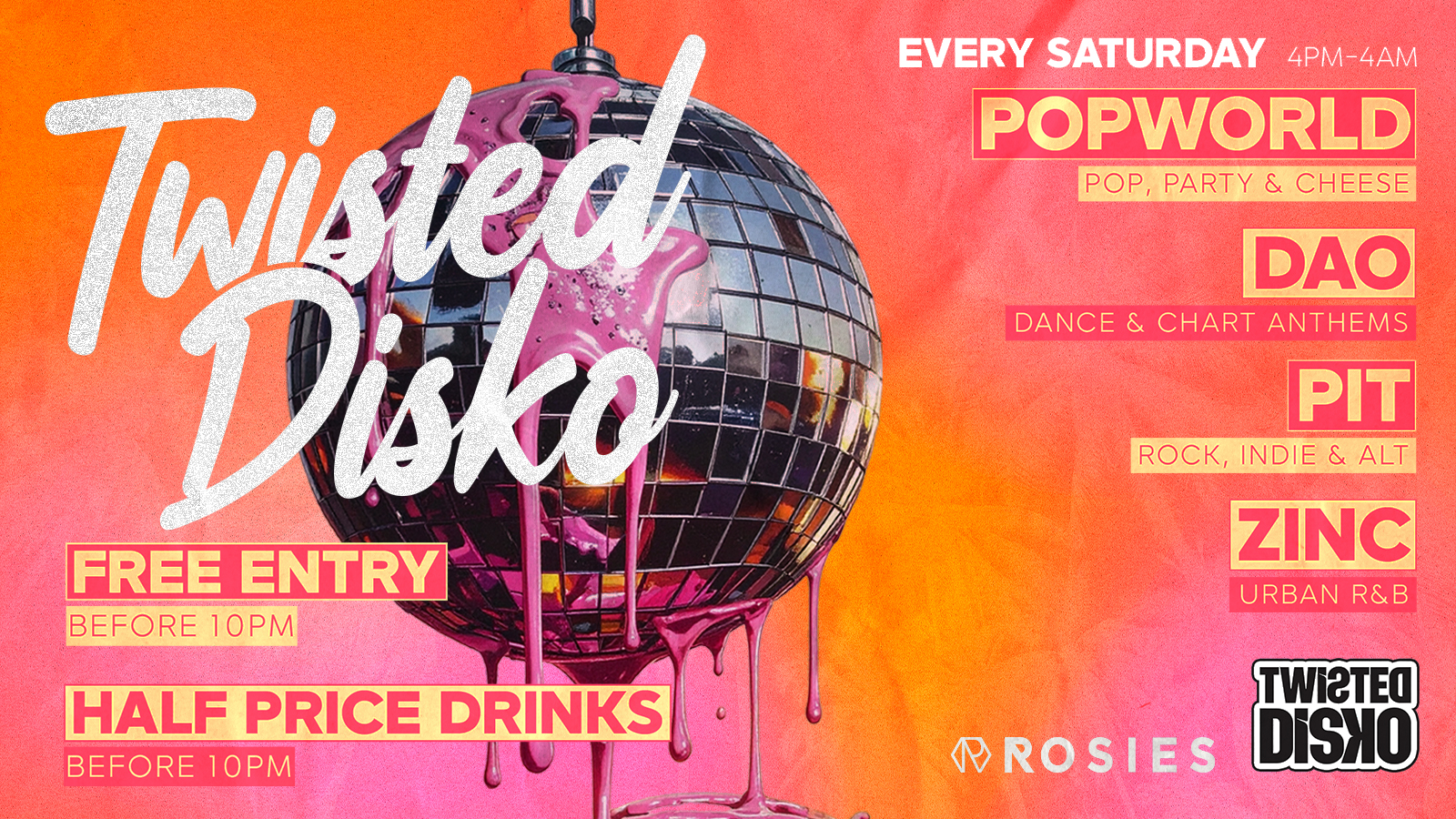 Introducing Twisted Disko! The ultimate Saturday night experience in Chester City Centre's premier nightclub: Rosies and Popworld.
