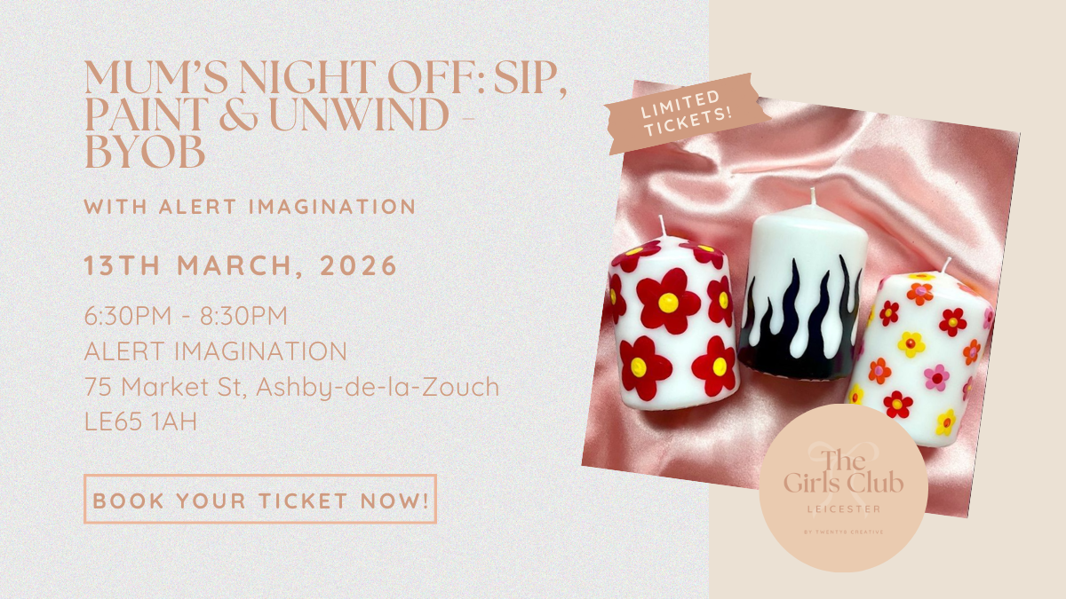 A cosy, creative evening designed especially for mums who deserve a break π This special collaboration between The Girls Club Leicester and Alert Imagination is all about giving mums a night just for themselves β no kids, no rush, just time to relax, create, and connect.