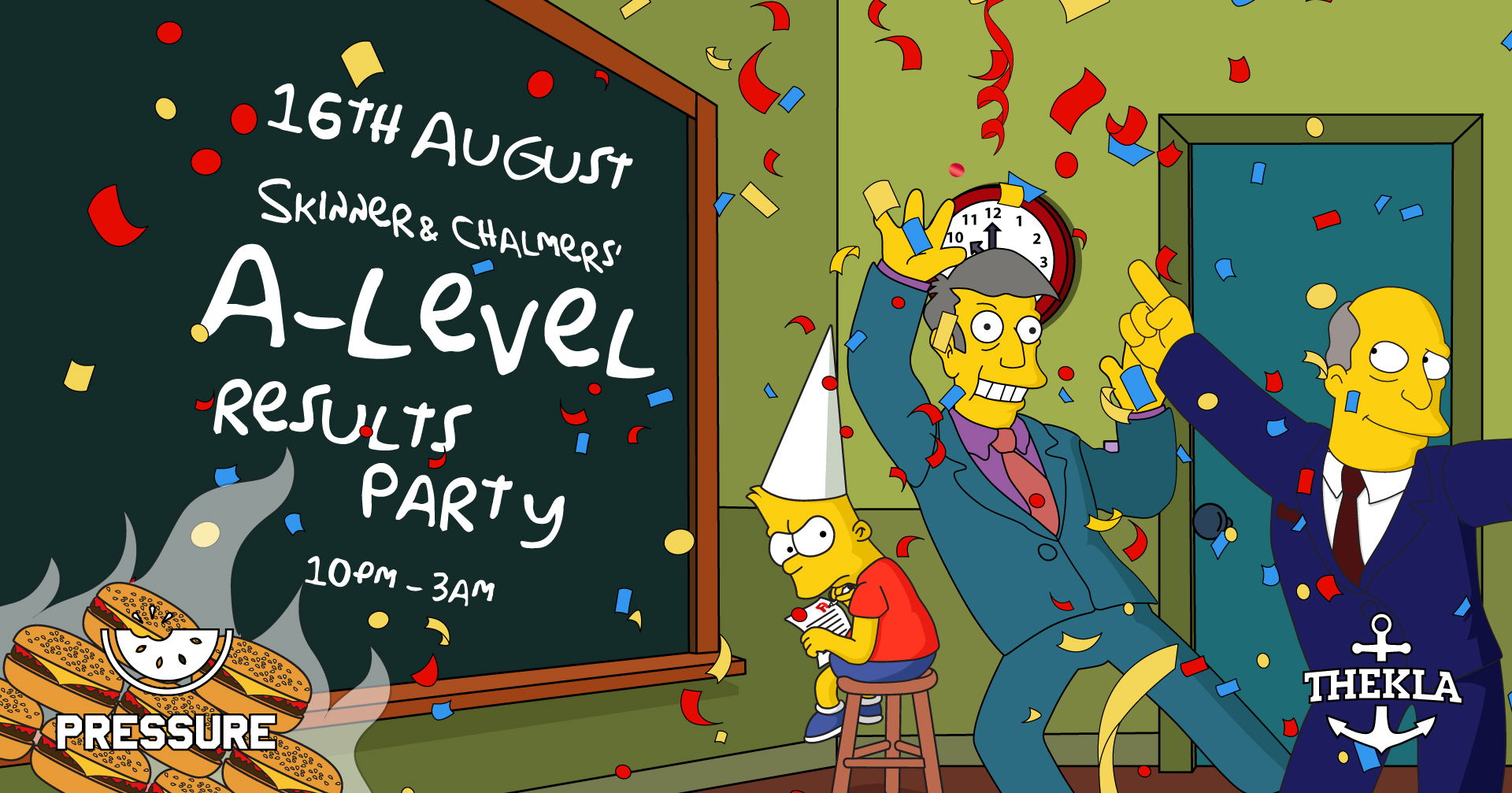 Join Skinner & Chalmers at Pressure for Springfield Elementary School's A-Level Results party! Disco Stu on DJ duties. Otto will be providing transport from Springfield to Thekla throughout the night. And Moe will be behind the bar serving the finest Duff in Bristol.