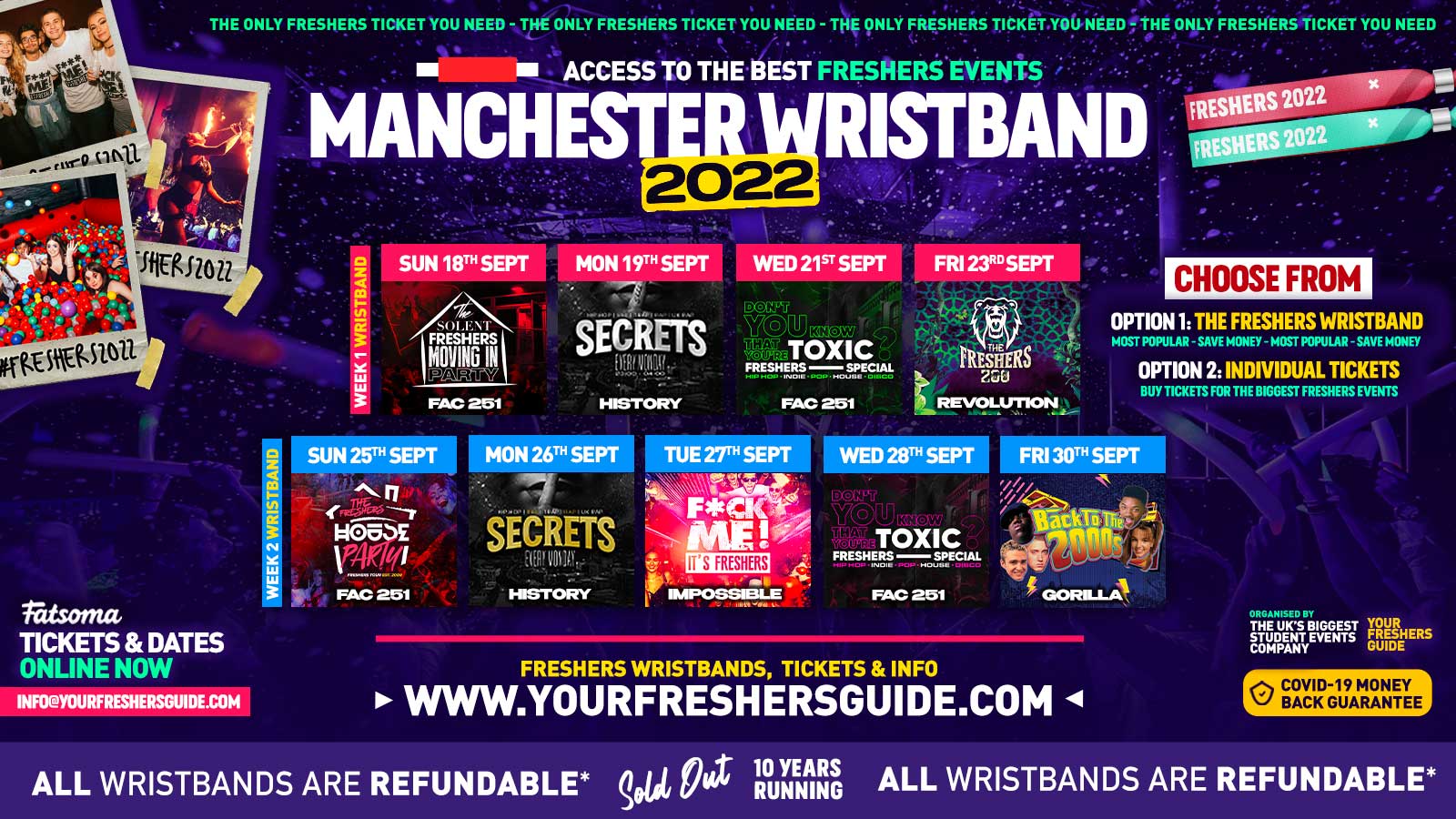 We understand that freshers arrive in Manchester at different times so we will be announcing several wristband collection times to match your convenience. Wristband collection announced August 2022.