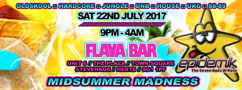 The saga continues... After another hugely successful HOME COUNTIES TOUR, EPIDEMIK returns to FLAVA BAR, STEVENAGE with our BIGGEST event to date. Once again PARADOX PROMOTIONS will be teaming up with RAISE THE ROOF who promise to bring to the masses a party like never before, so let the MIDSUMMER MADNESS commence! If you haven't already attended one of our previous events, then now's the time to get involved & bare witness to an event with some of the most friendly ravers & best atmospheres in the Country with a mind blowing production which is second to none. The Epidemik continues, are you ready? Oi oi