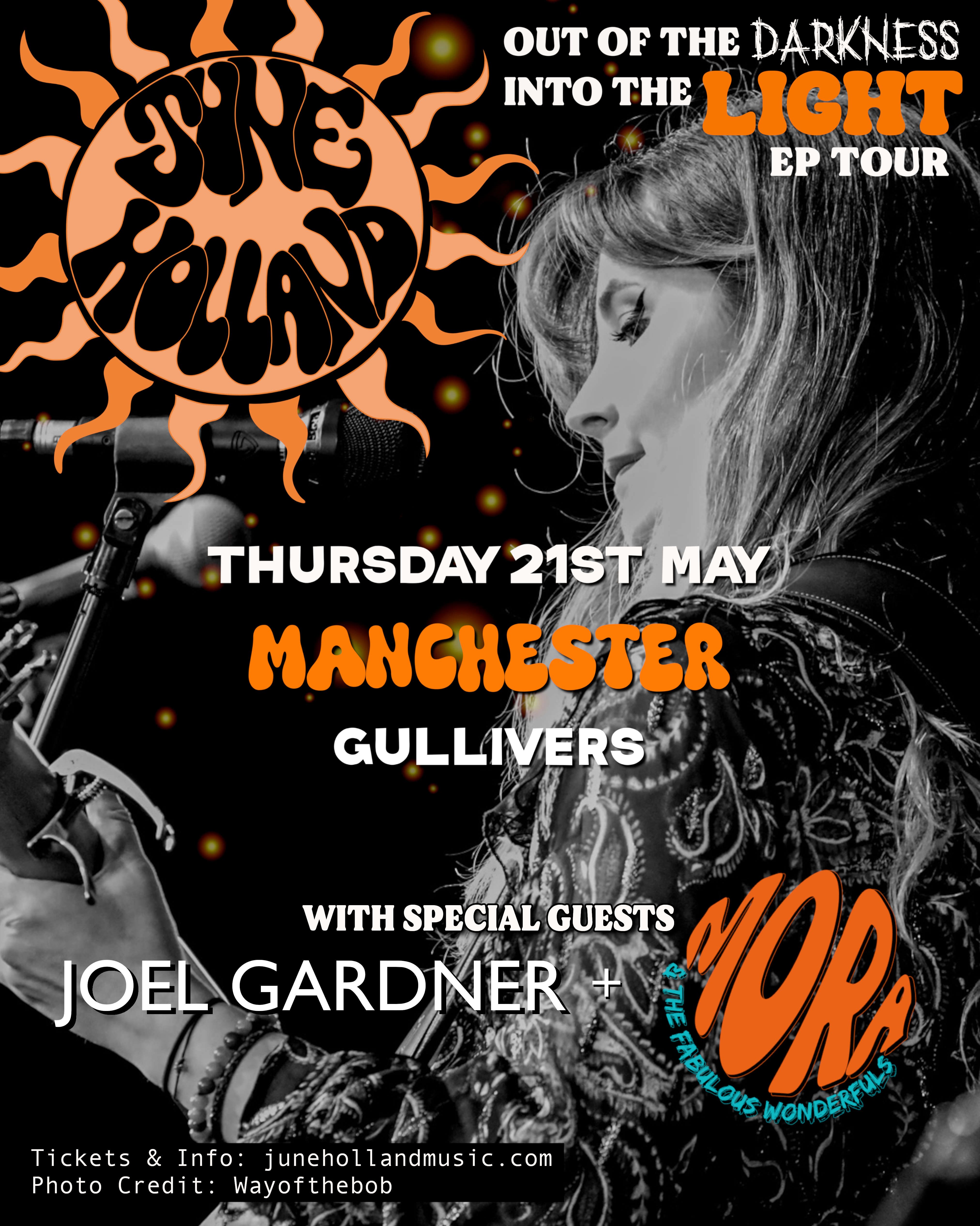 June had a fantastic 2025 packed with performances across the UK topped by a career defining moment, opening the Truck Festival Main Stage performing alongside Bloc Party, Blossoms, CMAT, Kasabian, Natasha Bedingfield and more. After a successful crowd funding campaign June has launched straight into 2026 creating new music! Having just recorded her debut EP "Out of the Darkness Into the Light" she is delighted to bring her new material to Gullivers in Manchester for her Hometown Headline debut with her FULL BAND and special guests Joel Gardner and MORA & the Fabulous Wonderfuls!