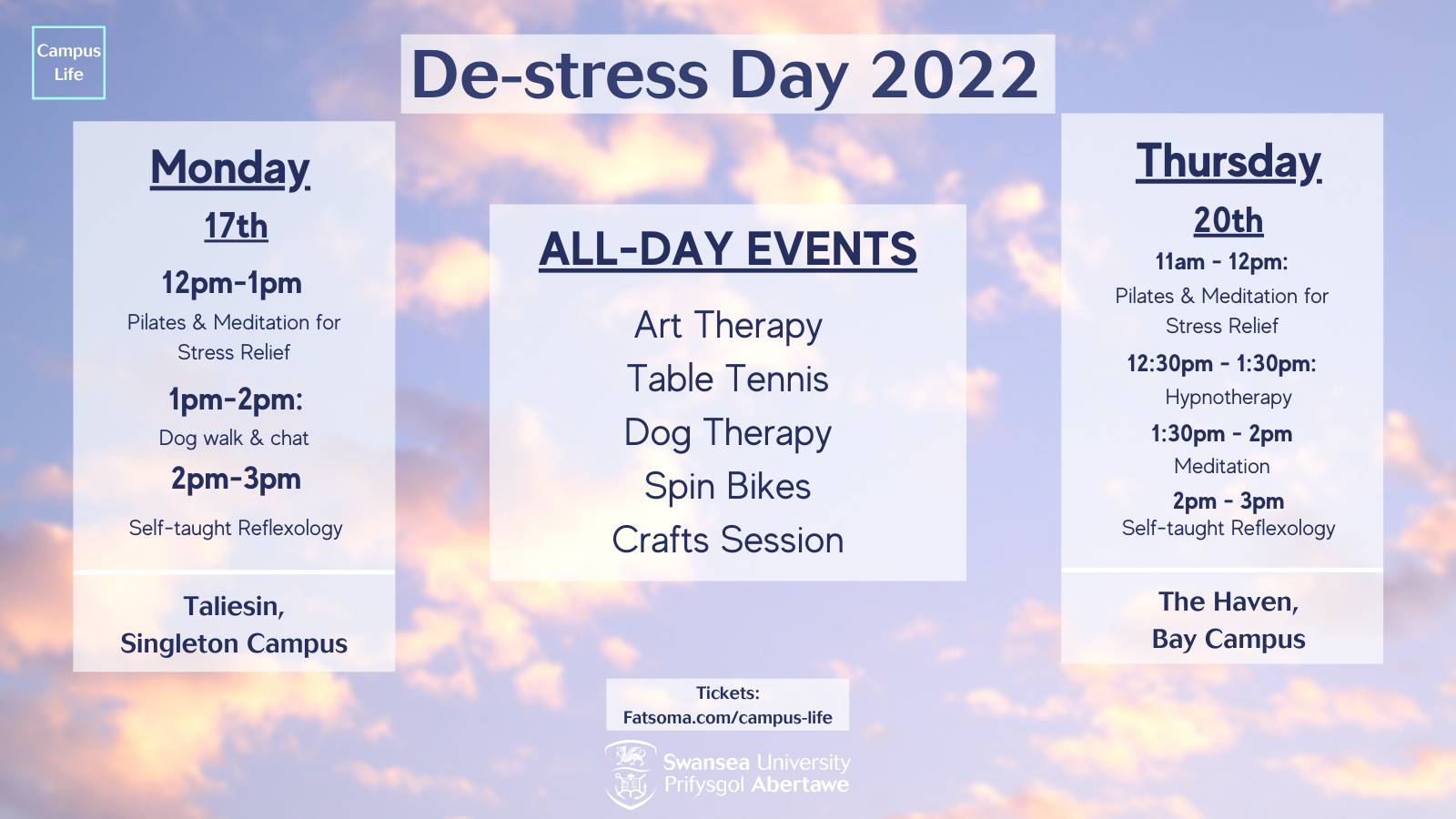 CampusLife are here to help with a friendly, informal de-stress day to help you escape the worry of exams and assignments! There will be a variety of activities run throughout the day, such as: