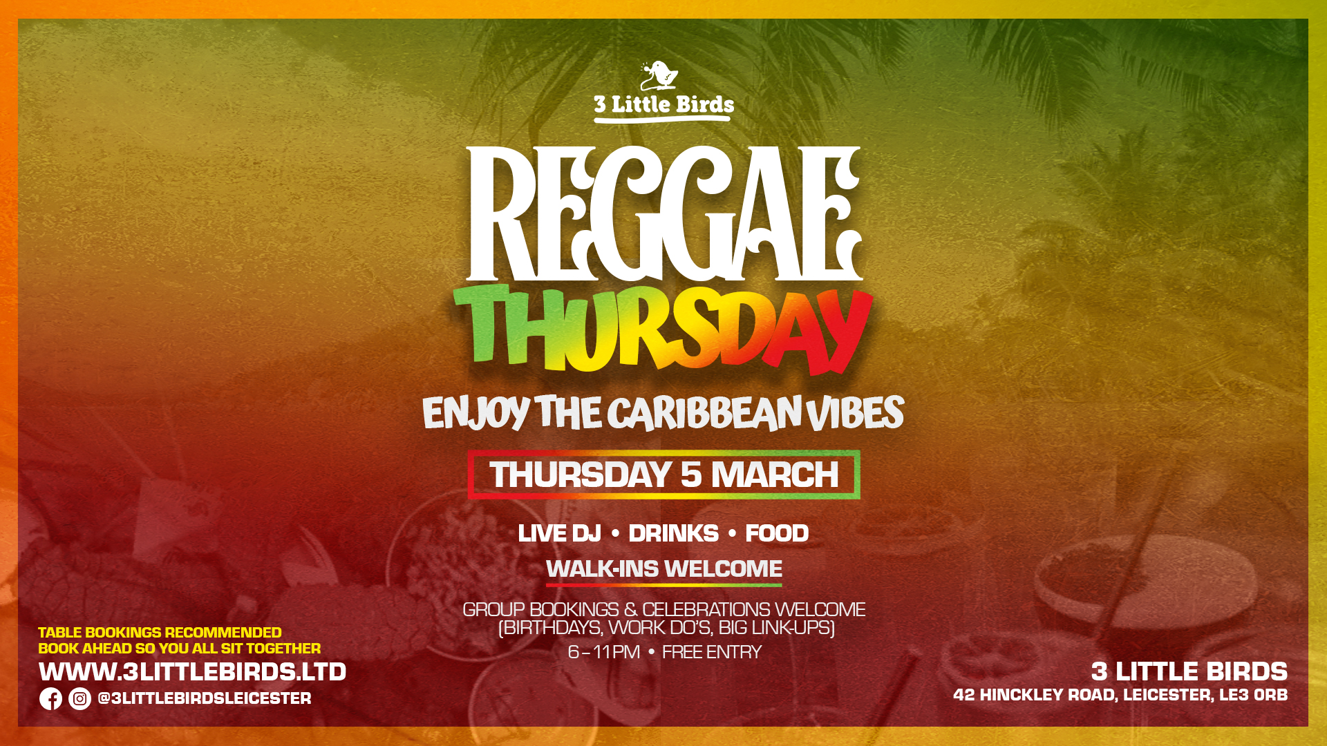 Launching our brand new Reggae Thursday at 3 Little Birds Leicester — Caribbean vibes all night with a live DJ, top drinks and proper good food.