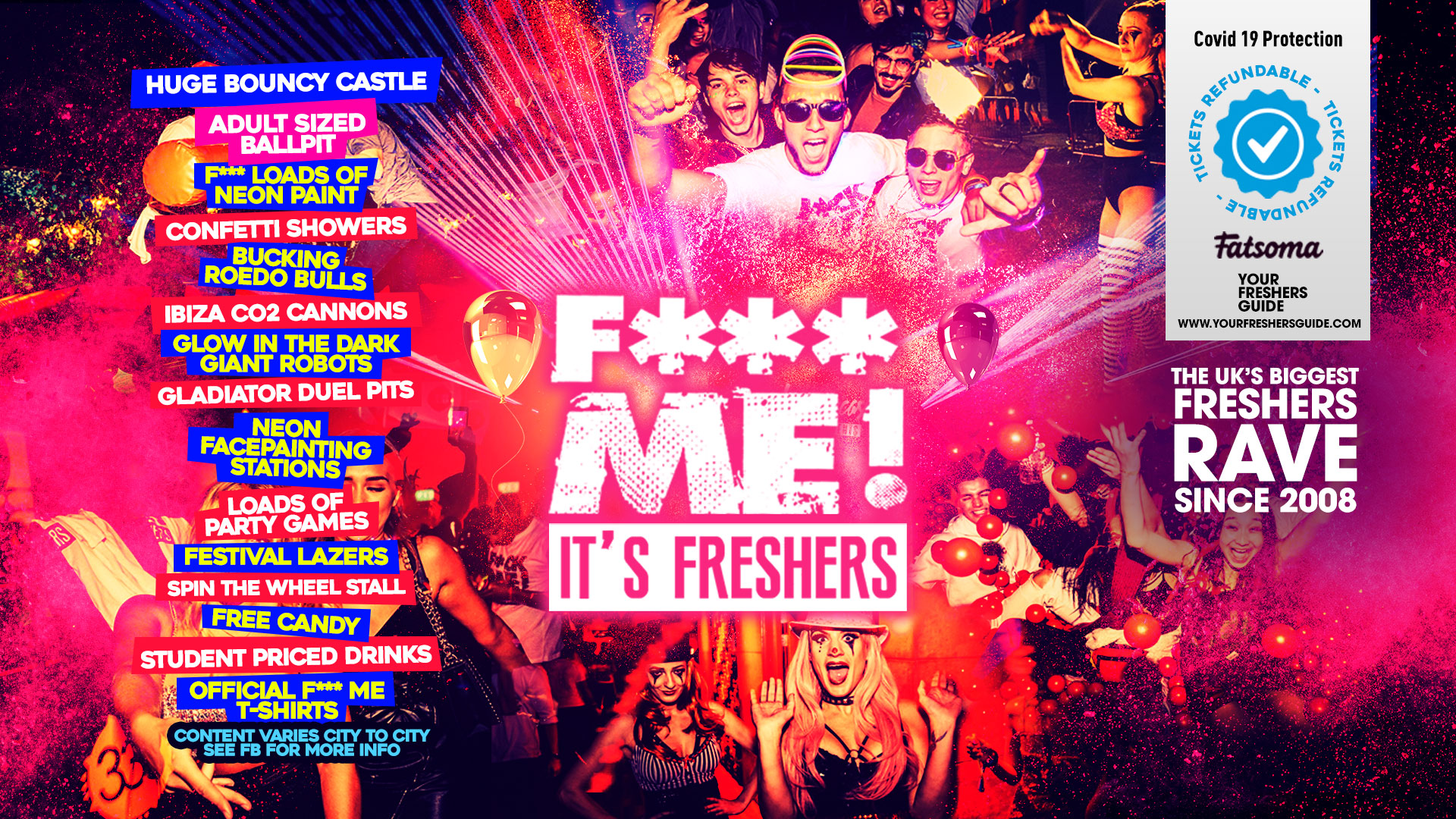 💦 Massive Foam Cannons 🏰 Giant Bouncy Castles 🔴 Huge Adult Ball Pits 🐂 Bucking Rodeo Bulls ⚔️ Gladiator Duel Pits 🎉 Crazy Confetti Drops 🔥 Insane Fire Performers 💨 Ibiza Co2 Cannons 🤖 Glow-in-the-dark robots 🌈 LOADS of UV Cannons 🌈 Thousands of FREE Neon Glowsticks 🎨 Neon Face Painting Stations 🎲 Loads of Party Games 🎡 Spin the Wheel Stall 🍭 FREE Candy Floss 🍕 FREE Pizza 🍭 FREE Candy 🎧 DJ & Hype Man 🏆 Raffle Prize (Entry with Every Ticket) 🥤 Student Priced Drinks