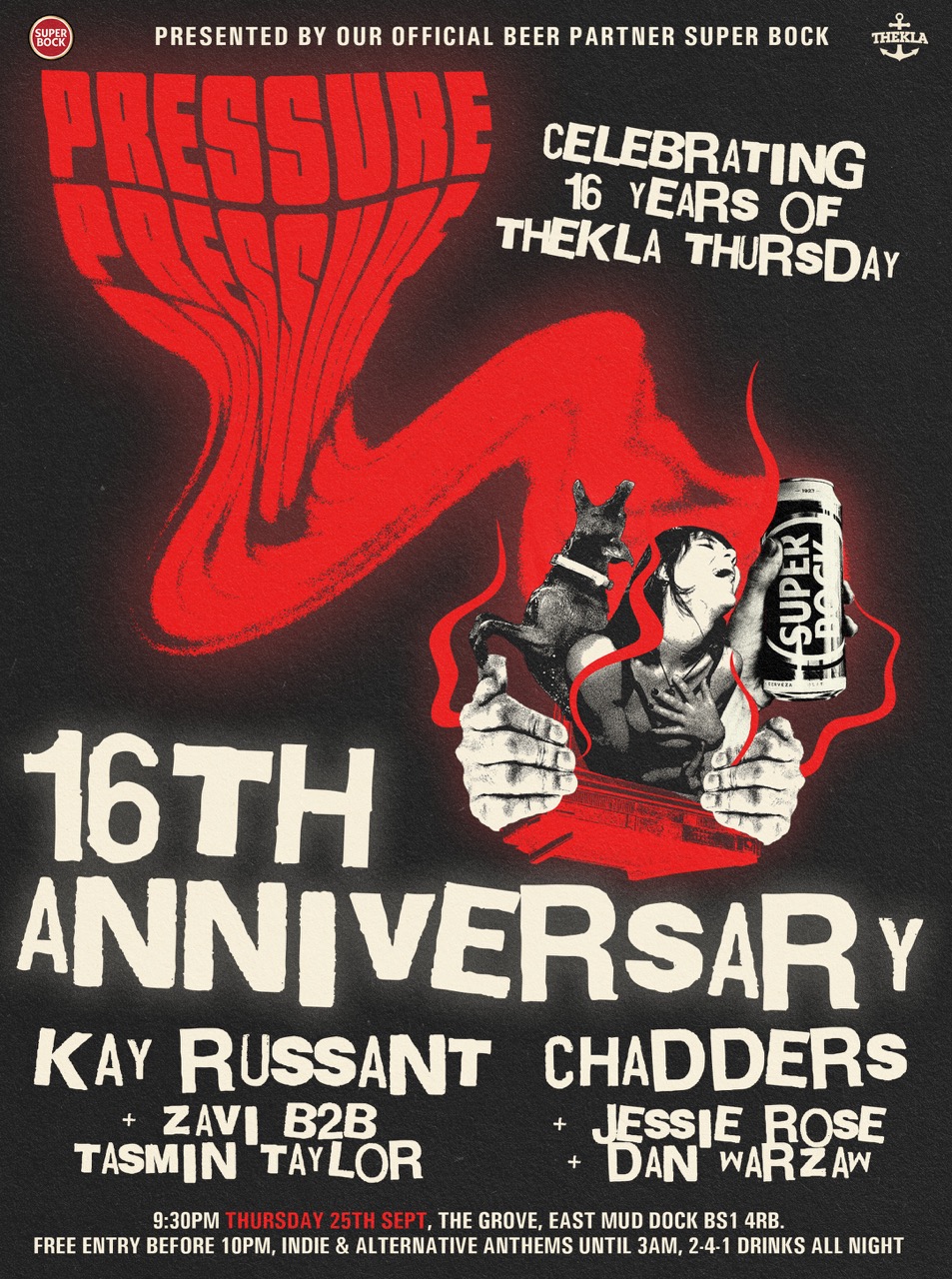 ➤ IN THE CARGO HOLD - Kay Russant all night long, our star of the main room, our beacon of indie light in the darkness. Non-stop bangers from aross the indie spectrum. And our headliners - Zavi b2b Tasmin Taylor bringing the first ever indie/rock dance set to Thekla Thursday. Expect a custom, never before seen one hour chaos-fest of remixed anthems. This is Pressure like you've never heard it before.