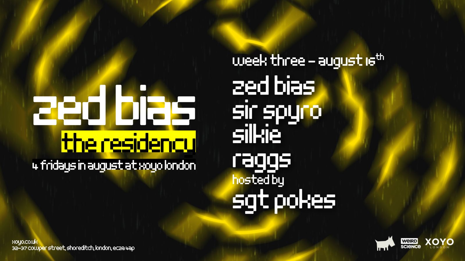 We are beyond proud to announce a four week residency with a true heavyweight of the UK music scene. Following on from his sold out event at fabric, and continuing the celebration of 25 years at the top of the game, Zed Bias joins us at XOYO London this August. Four curated events will showcase the amazing diversity of Zed's production and performance, covering UKG, funky, house, bass music and drum and bass. Joining Zed will be a high quality cast of DJs, singers and MCs, and of course, you!
