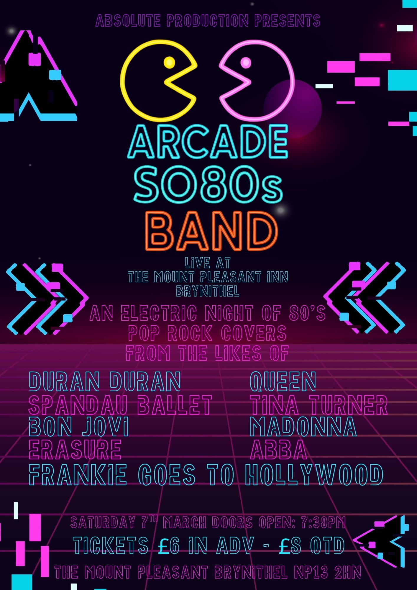 Get ready to experience the sounds of the 80's all over again on *March 7th*, where you can join us at *Mount Pleasant inn, Brynithel* as "Arcade: So 80's", the 80's Pop, Rock Covers act making waves on the scene, selling out venues around south Wales, delivers an unforgettable night of classic 80's hits. Feel the energy as they perform your favourite tunes with the passion and authenticity that defined the 80's pop era. Doors open at 7:30M, and tickets are just £6 in advance! Don’t miss out grab your friends, get yourself in your 80's neon disco outfits and get ready for a night to remember!