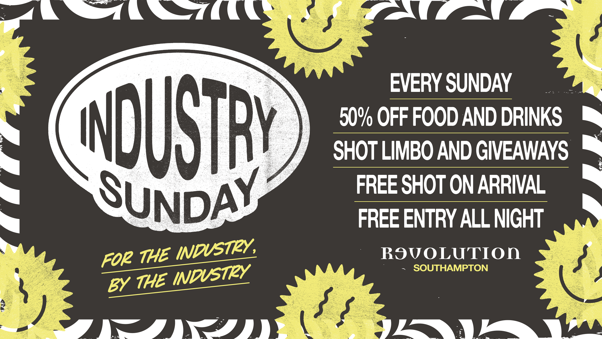 Welcome to Industry Sundays, the ultimate night for hospitality heroes and weekend warriors who deserve a BIG reward. We’re talking 50% off food and drinks ALL day and night—because you’ve earned it!