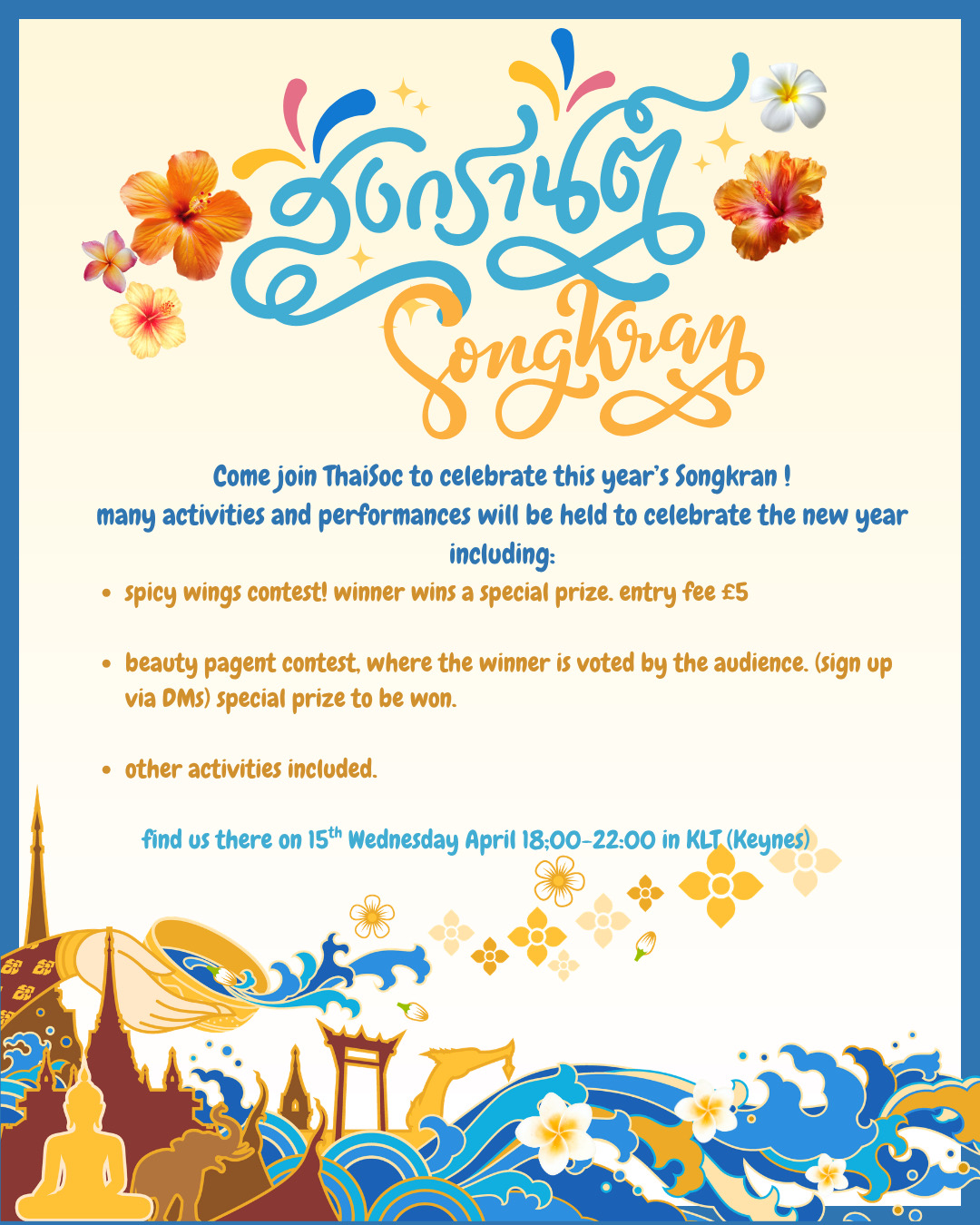 Songkran, the Thai New Year, is celebrated from April 13th to 15th. It's famous for its water festival, where people splash water on each other, symbolizing cleansing and washing away bad luck. This tradition comes from gently sprinkling water on elders as a blessing. Your university's Thai society is putting a modern twist on the celebration with a spicy wings contest and beauty pageants!