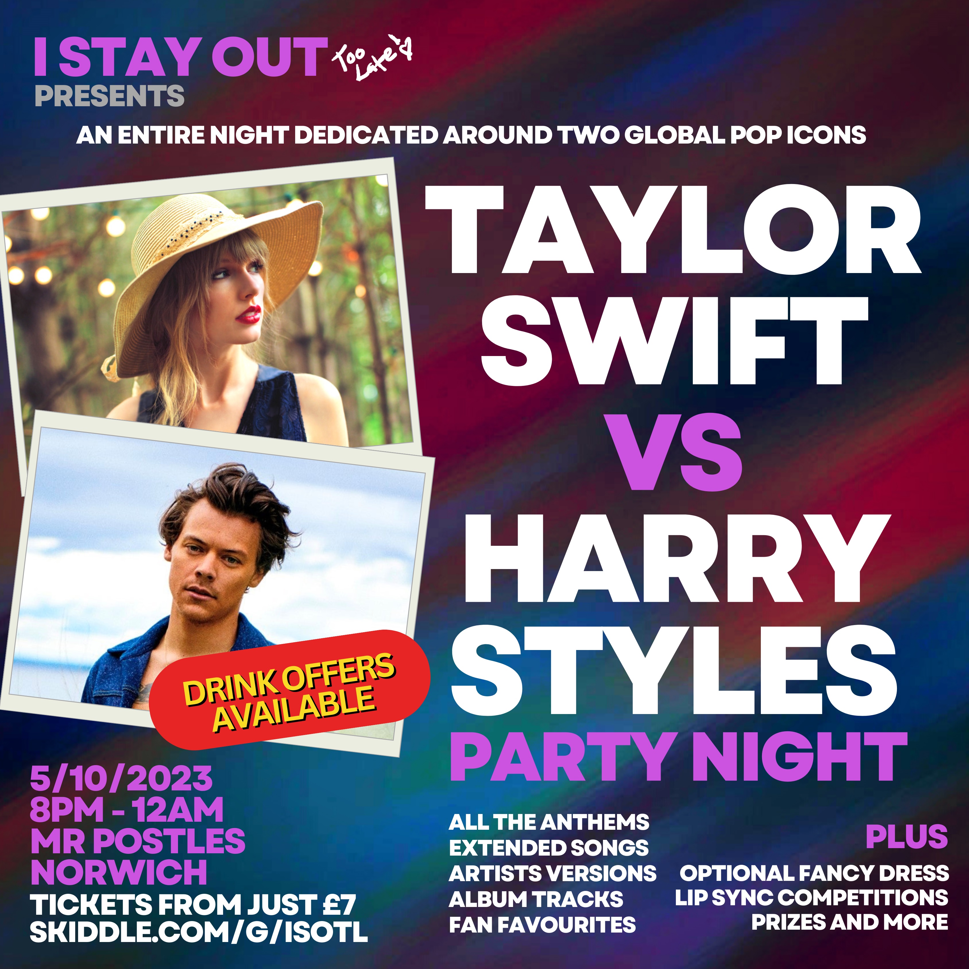 I STAY OUT TOO LATE presents the TAYLOR SWIFT & HARRY STYLES CLUB NIGHT you really don't want to miss! Are you ...Ready For It?