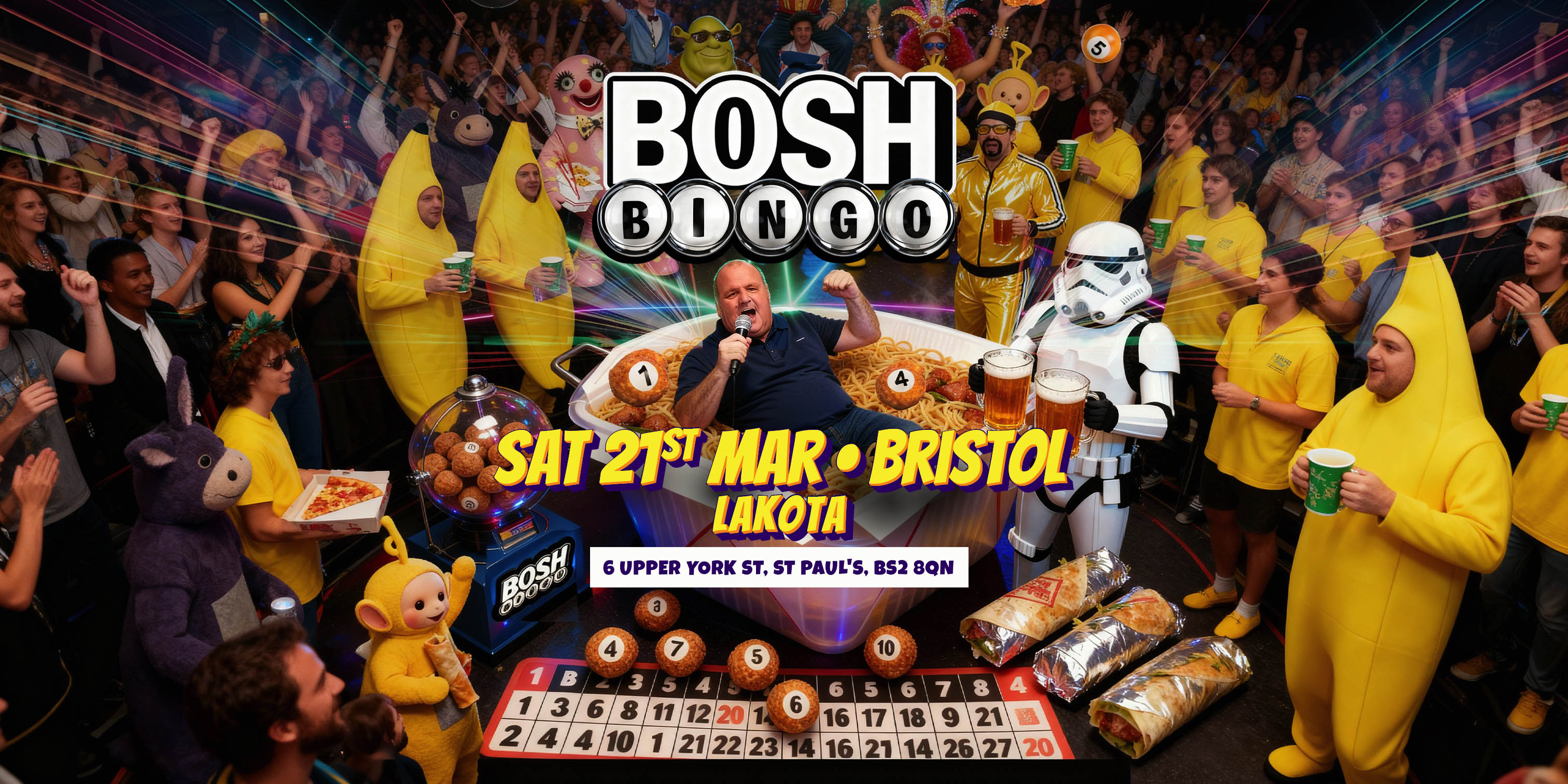 Prepare for 3 hours of pure chaos, belly laughs, and Big John energy from start to finish. Grab your mates, warm up your vocal cords, and get ready to BOSH your way to bingo glory!