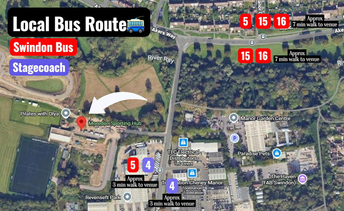 The Moredon Sporting Hub is located close to several bus routes accessible from the town centre.