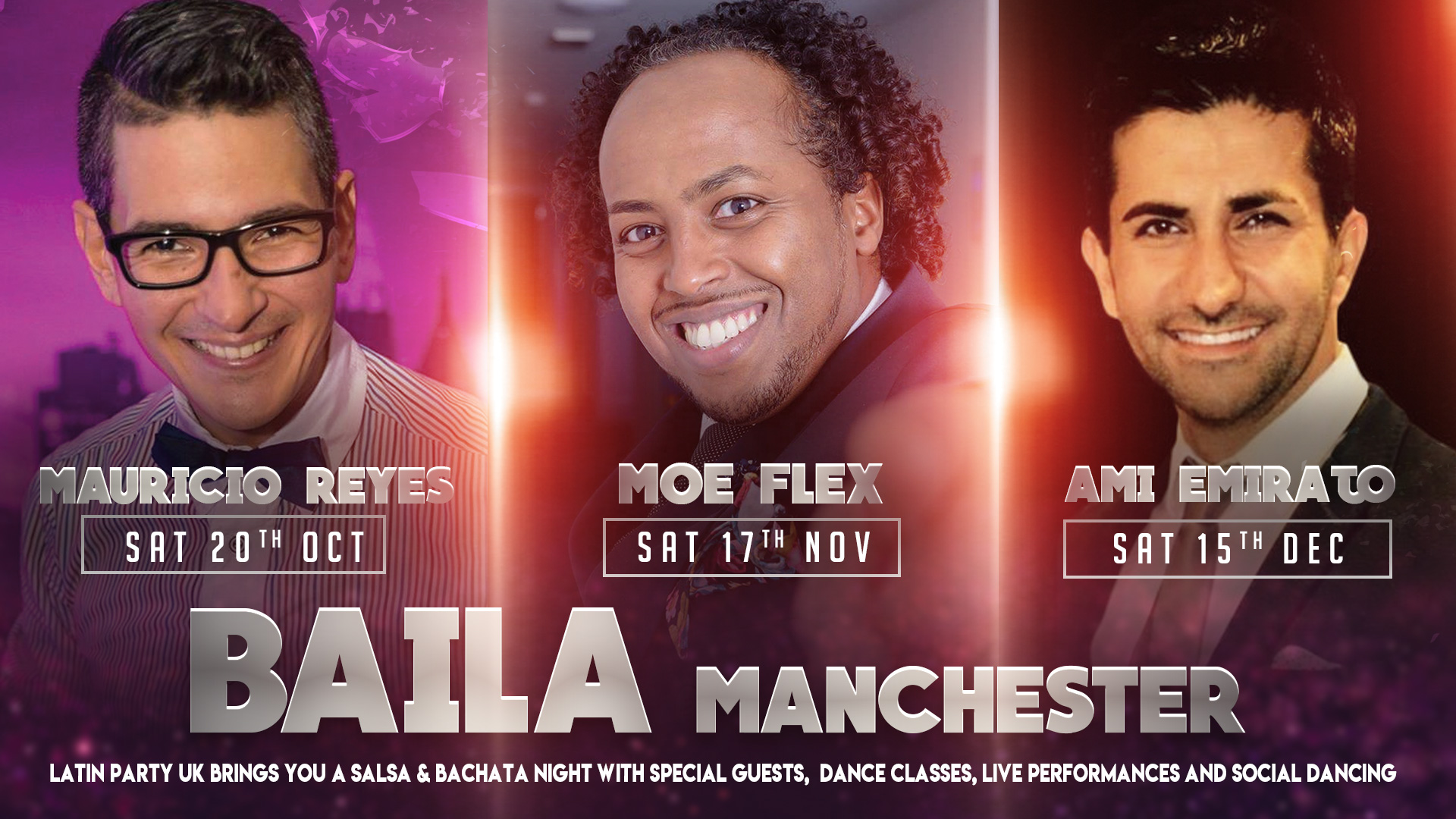 We have been aiming to bring fresh new vibes in a unique one off special events format since we launched. Our passion for Latin Muisc is huge and we have been working hard to channel through different events and club nights the different genres of music Latin America offers. Now we Bring Baila Manchester (Dance Manchester). For our next batch of events for dancers we are very proud to bring: Moe FlexMauricio Reyes and Ami Emirato to Manchester alongside our local/regional talent: Las FierasKiara SanzMKYayo, and many more performers & DJs TBA