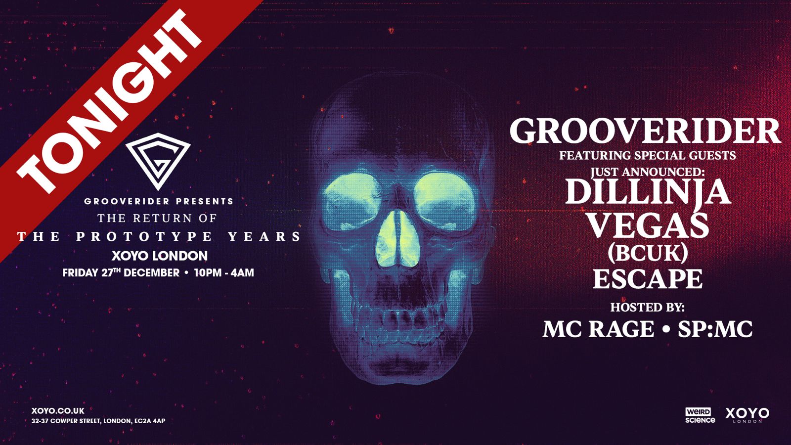 This December at XOYO London, we celebrate the seminal late 90's label and compilation that defined a golden era of drum and bass, Grooverider invites a cast of his favourite DJ and MC's to take you into the dark and twisted sound of Prototype.