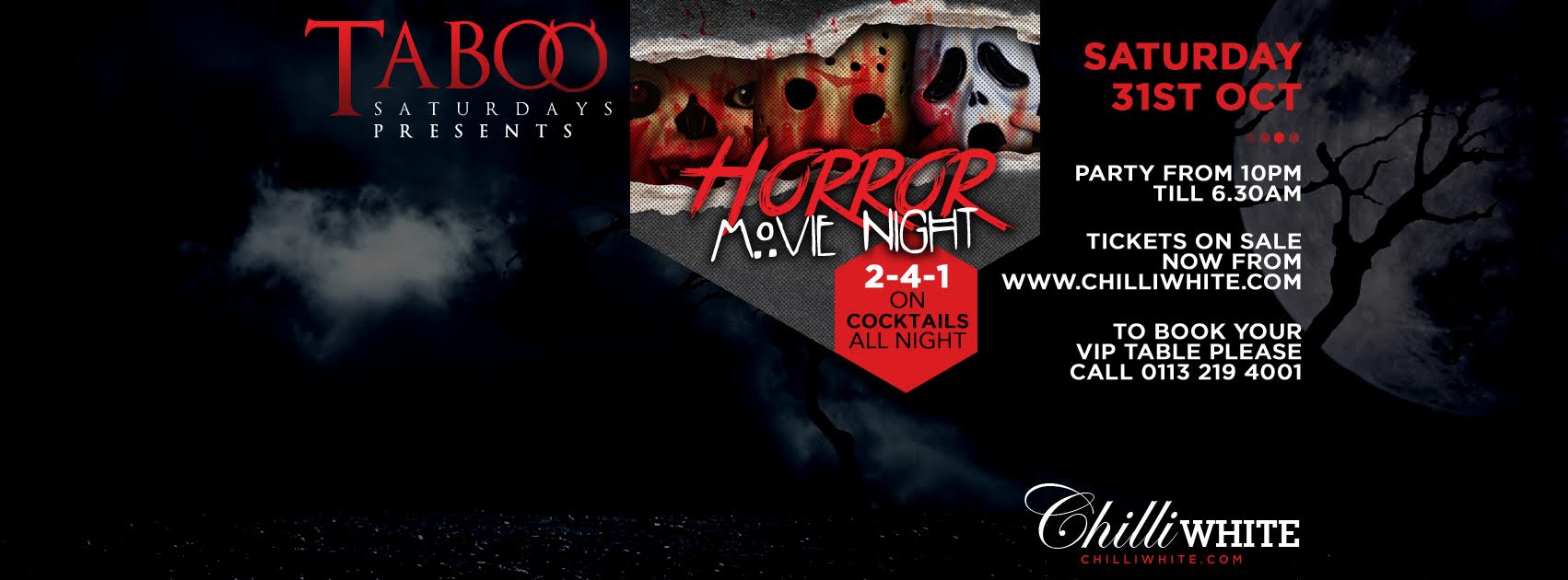Join us Saturday 31st October from 10pm as TABOO Saturday's presents THE HORROR MOVIE HALLOWEEN PARTY!!!.... Expect the unexpected as we deliver you 3 floors of pure HORROR!! Music from Leeds best residents, 241 on cocktail all night and large selection on champagnes and drinks. To upgrade your night to scary VIP Booth then please email info@chilliwhite.com or call 0113 219 4001 Full club decor and live entertainment all night long