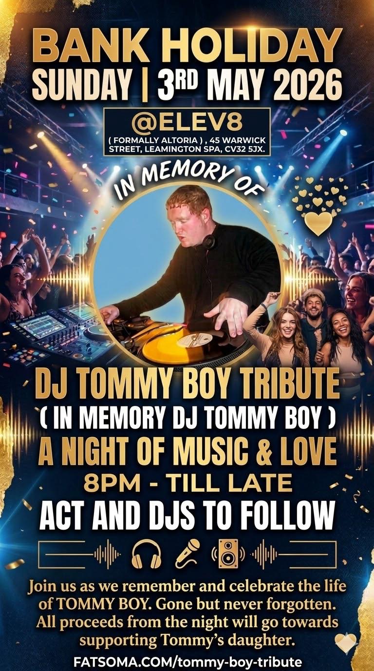 Join us for a night of music and love as we celebrate the life of DJ Tommy Boy at the newly refurbished Elev8 Nightclub in Leamington Spa. The venue was formerly Altoria Nightclub, where Tommy was a resident DJ for several years.