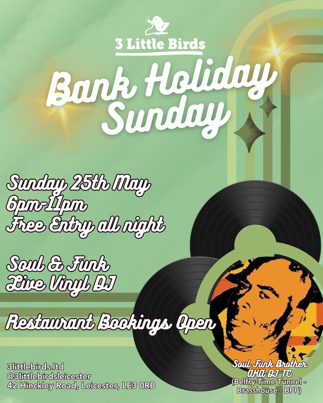 Get ready for a Sunday Night extravaganza at 3 Little Birds where we'll be spinning your favourite vinyl tunes Live all night from 6pm - 11pm! Get ready to dance and sing along to classic Soul and Funk tunes spun by our talented special guest DJ Soul Funk Brother, aka DJ TC. With his impressive experience playing at top venues like Belfry, Time Tunnel, Brasshouse, and BPP, you can be sure that he'll keep you moving to the grooves all night long.