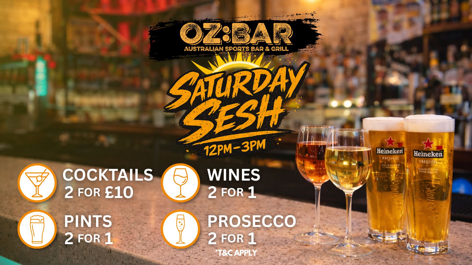 Get your weekend started the right way with OZ:BAR’s Saturday Sesh! Join us every Saturday from 12pm-3pm for unbeatable daytime drinks deals, great vibes, and the perfect atmosphere to kick back with friends.
