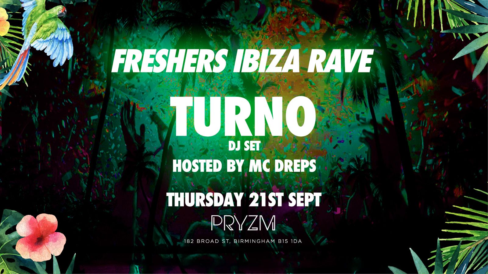 Where you gonna go when the raves out?? Freshers week in Birmingham just got hotter! Get ready to embark on a journey to the white sands and electric vibes of Ibiza right here in Pryzm Birmingham. We bring you our annual Freshers Ibiza Rave, this year we have secured a huge D&B Headliner and man of the moment TURNO with his host MC DREPS 🔥