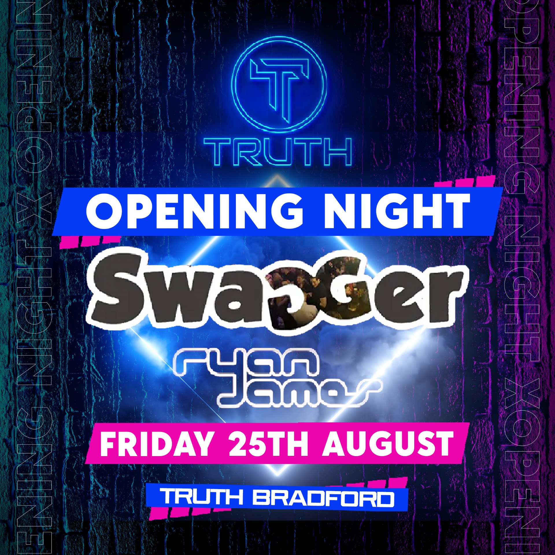 Join us for an unforgettable night of music and partying as we celebrate the grand opening of Bradford's newest Nightclub, Truth! We're excited to have Swagger with Ryan James, one of the hottest DJs in the UK, spinning the latest tracks and keeping the dance floor packed all night long. With state-of-the-art sound and lighting systems, you'll feel like you've stepped into another world as you dance the night away. Don't miss out on this incredible event and be a part of the Truth experience!