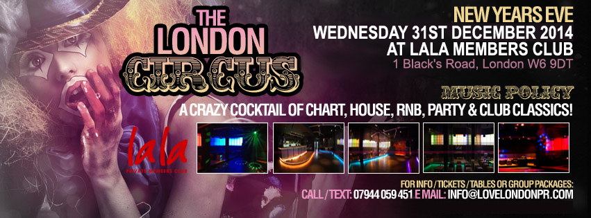 You are Cordially invited to The London Circus At Lala's Members Club London this New Years Eve 2014. Celebrate at what promises to be London's most talked about Party of 2014.