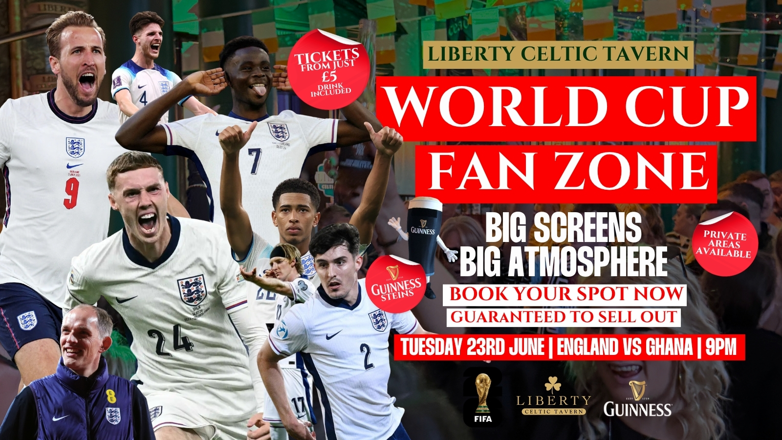 We’re turning Liberty Celtic Tavern into a full World Cup Fan Zone for every England match with big screens, big atmosphere and a proper match day crowd from start to finish.