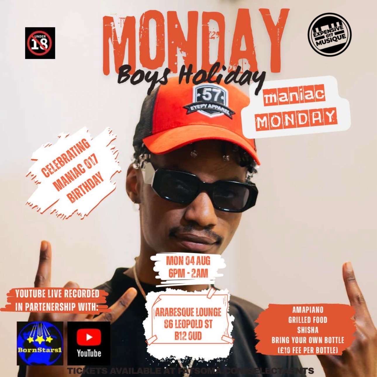 MONDAY BOYS HOLIDAY, maniac MONDAY. We are celebrating Maniac 017's birthday this coming Monday, and we have an all-star lineup of DJs and Hosts . Hope you are ready for this one, curated in collaboration with Maniac 017. Grilled food, shisha & drinks available all night. Bring your bottle for a small fee of £10 per 70cl Bottle.