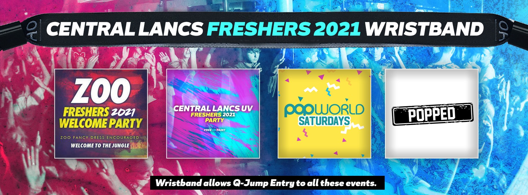 The ultimate Freshers Wristband which gains you Q-Jump access and entry to 4 of the biggest Freshers Events.. The legendary Freshers Welcome Party - ZOO Theme Special, The UV Party, The Indie Party and the Popped One Direction Special!