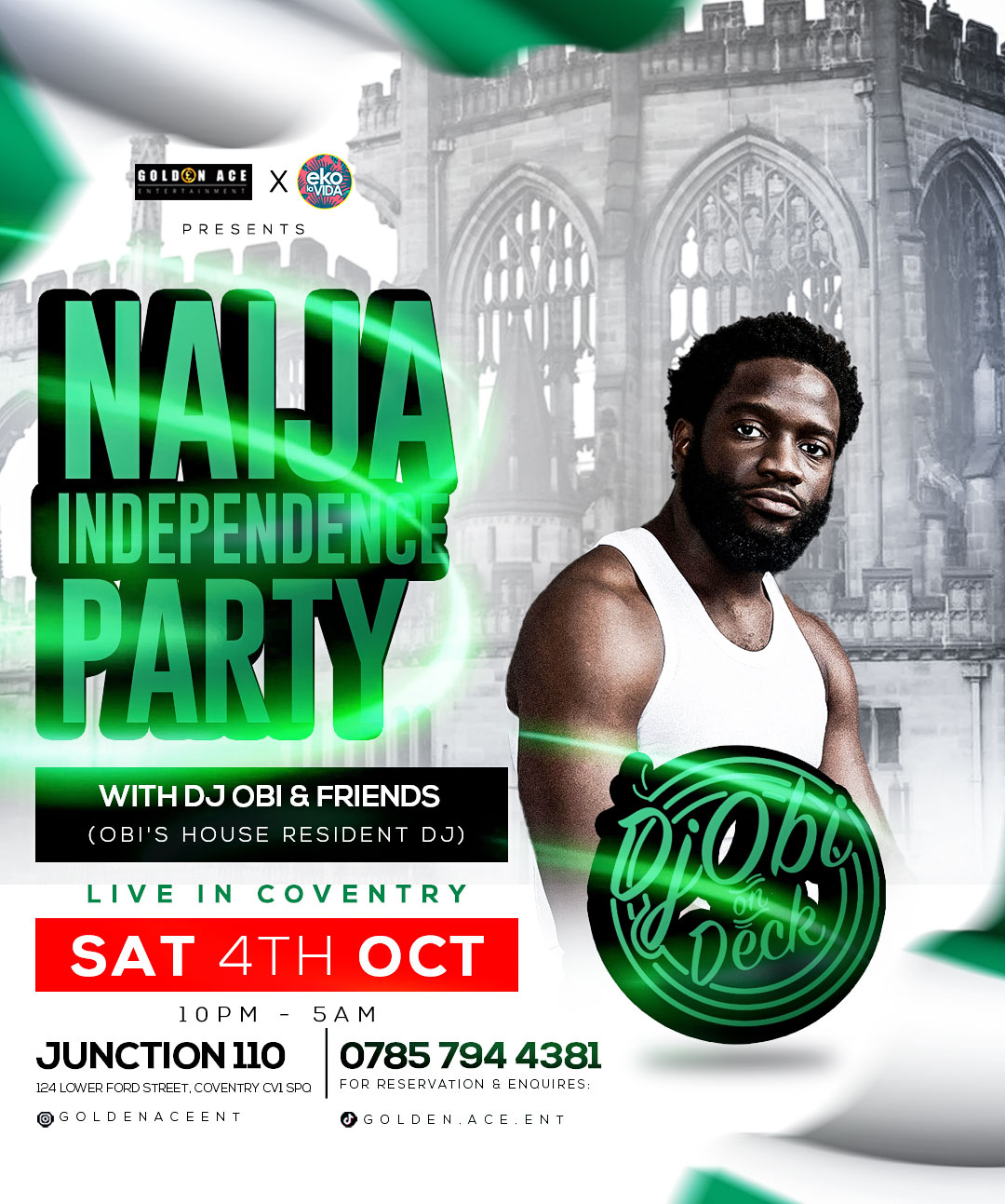 To celebrate Nigerian Independence we decided to bring all the way from. Lagos to Coventry, the famous world class DJ & Artiste; DJ Obi from Obi's house. He will be manning the decks and perform a few of his tracks.