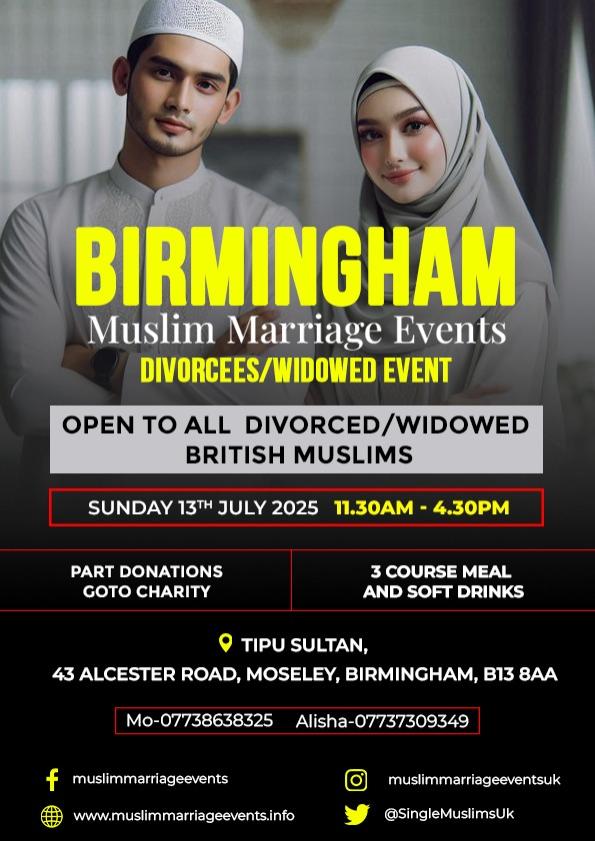 For more info please call Alisha on 07737309349 or Mo on 07738638325 or visit https://muslimmarriageevents.info/event/divorcee-widow-event/