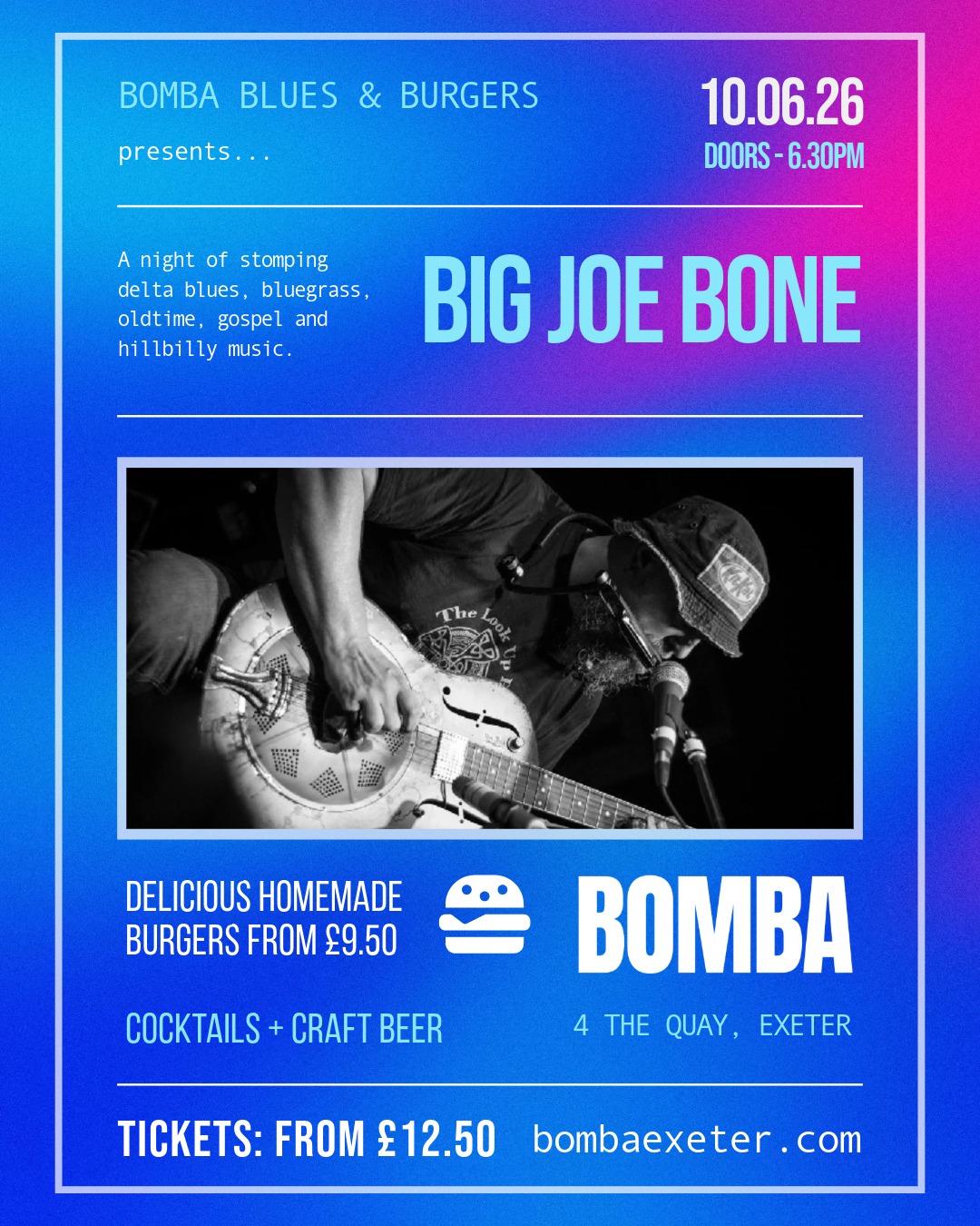 Blues & Burgers is back. Time to turn down the lights, fire up the grills, and enjoy an evening with the fantastic Big Joe Bone.