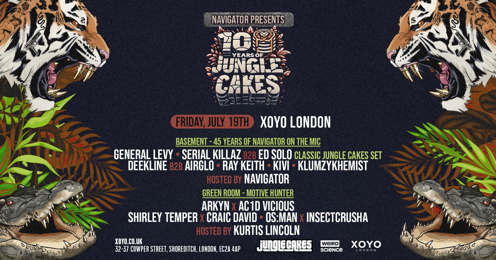 This year we celebrate 10 Years of Jungle Cakes in the dance, the UK’s leading purveyors of dubwise Jungle / Drum & Bass. Taking over the iconic XOYO, for four Friday nights in July this summer, with specially curated line ups from Deekline, Ed Solo, Navigator and Benny Page, the crew will be bringing the heat like never before! 💥🦁🔊🔥