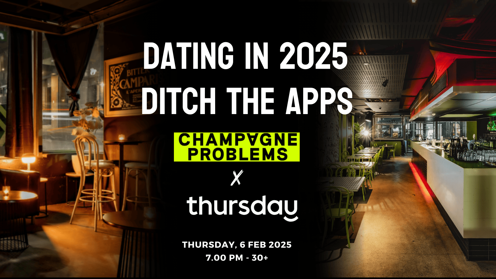 We've got two events this week due to the incredible demand from all you beautiful Melbourne singles. Join us for an over 30s event at Champagne Problems in the CBD.