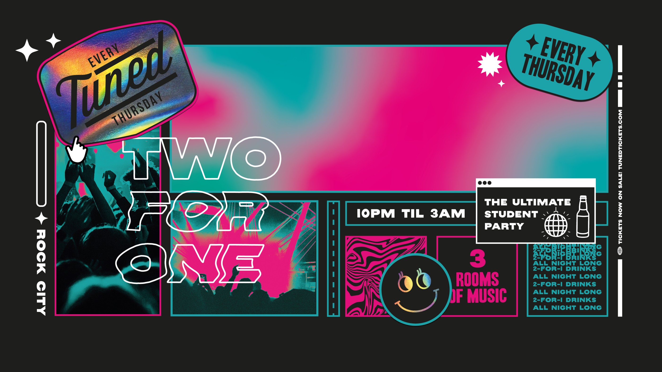 🎉 TUNED is Nottingham’s BIGGEST student night! We take over Rock City every Thursday and have 2-4-1 drinks all night long! 🎉