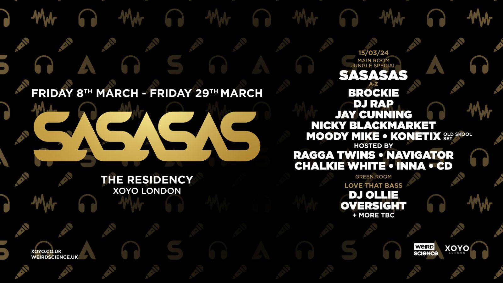 "We’re really buzzing that SASASAS will be joining the long list of amazing artists to have held a residency at XOYO London. This March, we have curated four events covering a wide spectrum of Drum & Bass, Jungle and Rave, digging deep into our musical DNA, and representing the best of scene, past and present. Come join us and a long list of some of the finest DJs and MCs for what is destined to be a really special month." - SASASAS