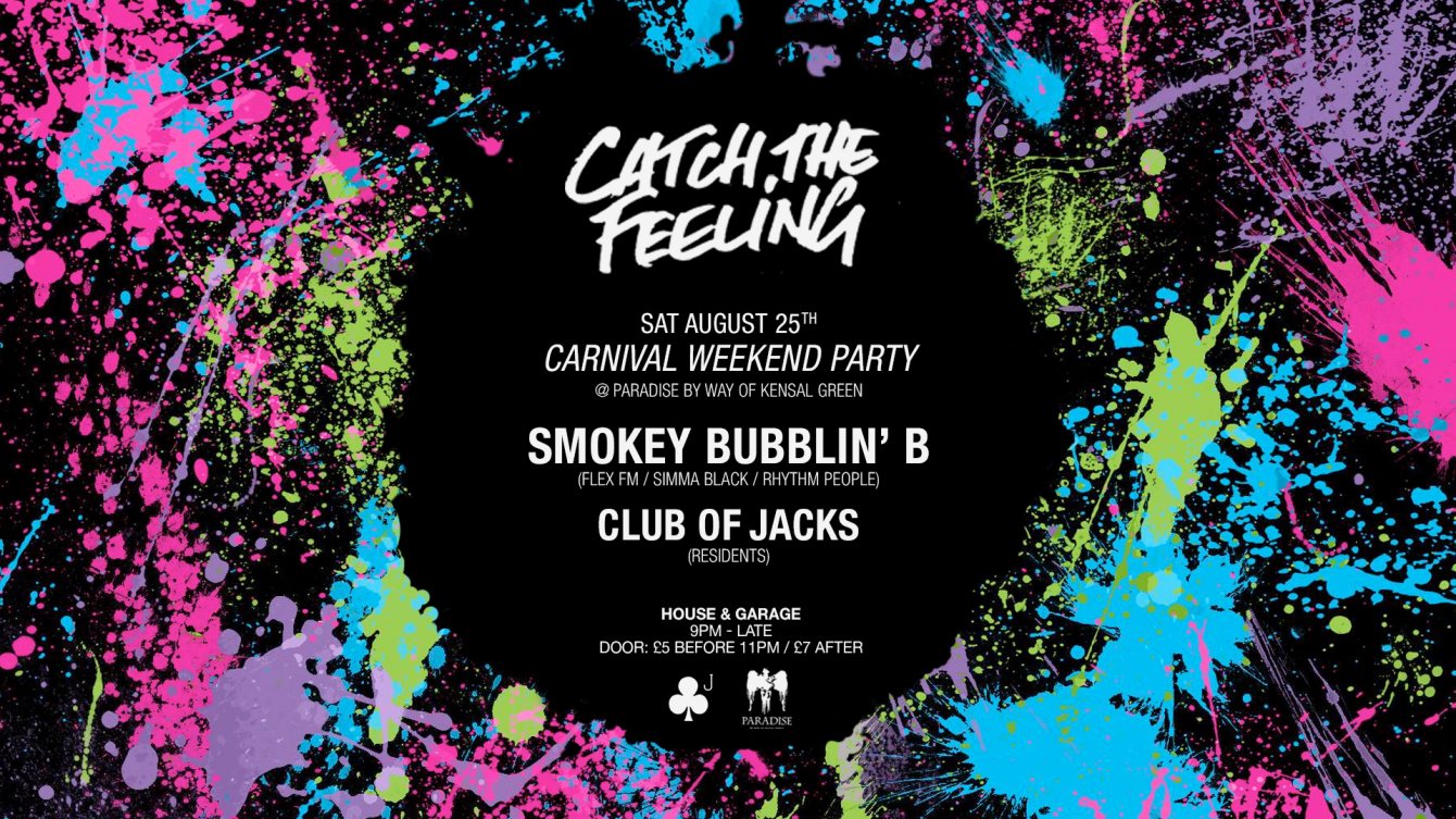 After a successful launch night last month, Catch The Feeling returns to Paradise. Join us for a special Carnival weekend party playing the best in House & Garage from the underground, alongside classics and rarities from the UK and around the world.