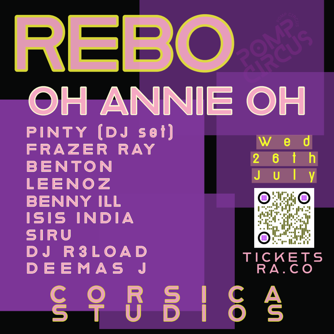 Pomp Circus launches REBO at Corsica Studios - A heavy hitting Wednesday night of B-lines and beats with 6 DJ's on the night spearheaded by Oh Annie Oh across 2 rooms - Get your midweek jump up fix at the highly regarded Corsica Studios London. Who doesn't love those mid week wild ones? Come and swap the weekend for a Wednesday.