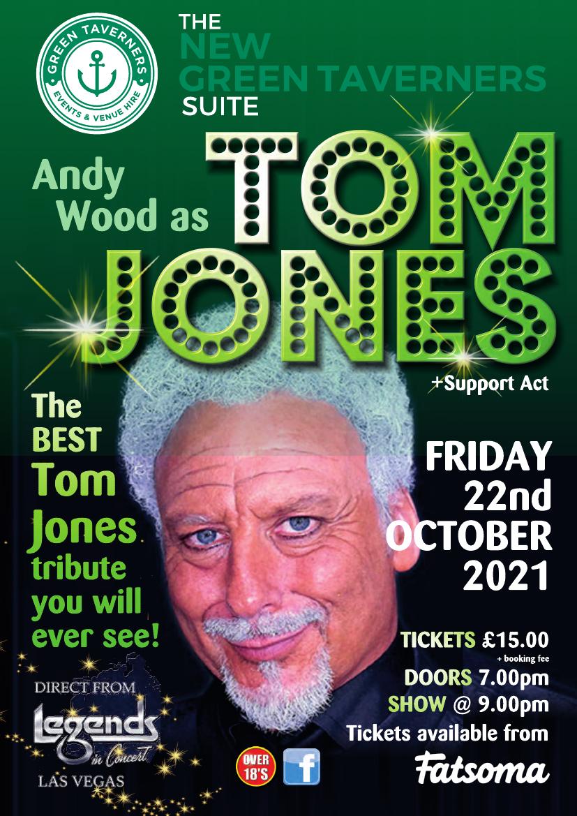 All the way from Benidorm the fantastic Andy wood as Tom Jones will be live at the new green Taveners suite.