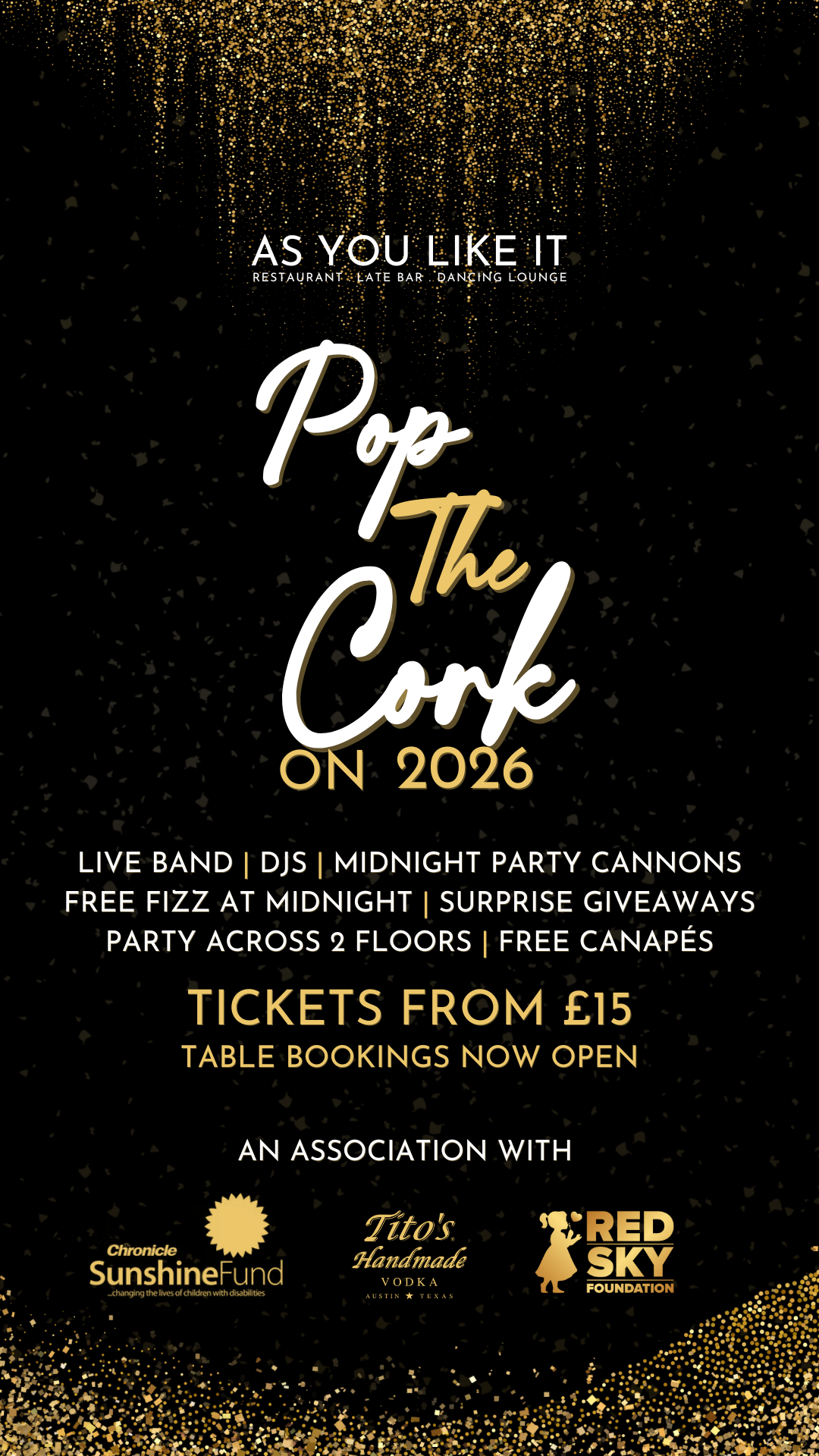 We are partnering with Titos Vodka to help raise funds for the amazing Charities, The Sunshine Fund & Red Sky Foundation this new year. The doors will be opening from 8pm and upon arrival you will have a glass of Fizz to enjoy before making your way into the venue for more drinks and entertainment. With the evening spread across 2 floors, surprise giveaways, a live band, DJ and canapés for you to enjoy throughout the evening.